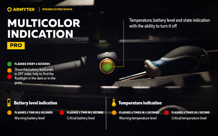- Pro Multicolor temperature, battery level and state indication with the ability to turn it off.
