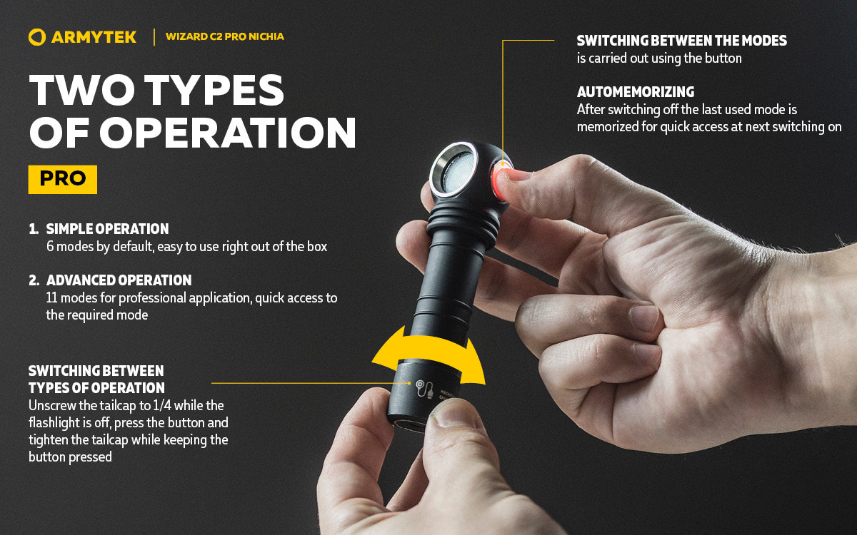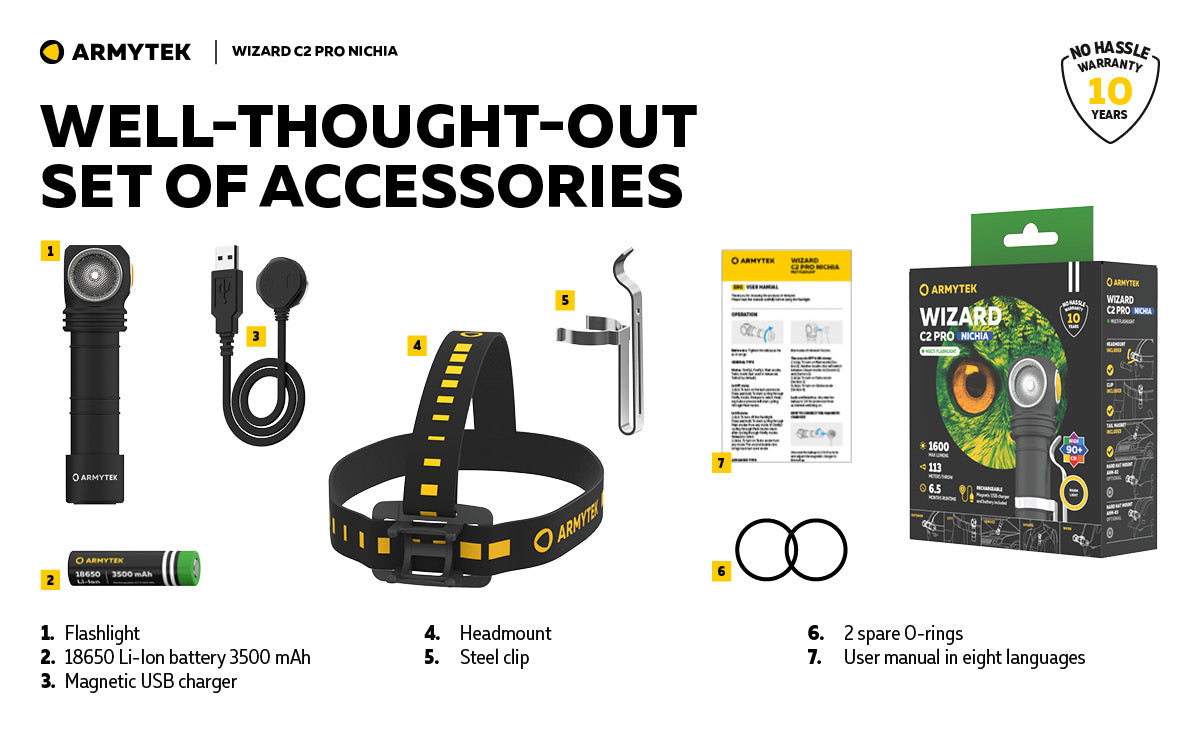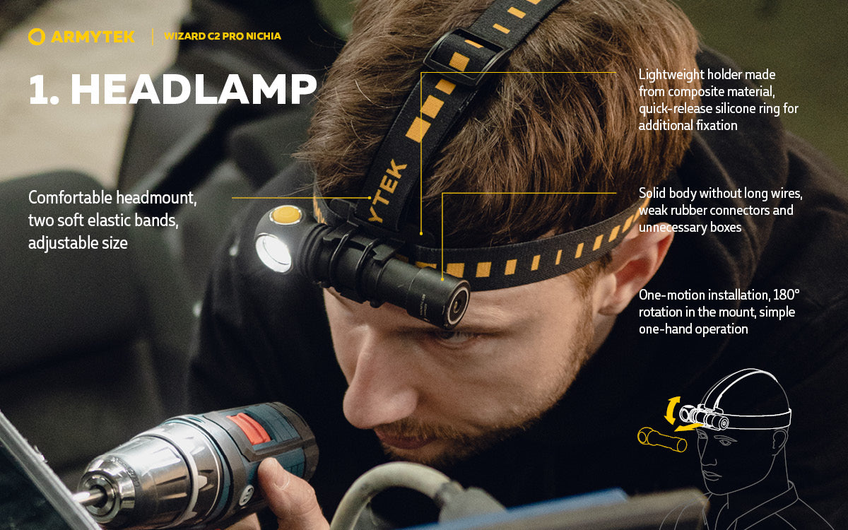 Thanks to the extended set of accessories with a head-mount, clip, magnet in the tail-cap and ABM-01 bicycle mount (Not Included), the multifunctional 3 in 1 flashlight is suitable for outdoor activities, sports, fishing, hunting, car maintenance and service. Wizard C2 Pro Nichia is compatible with hard hat mount AHM-02 and can be used as primary power source for construction.