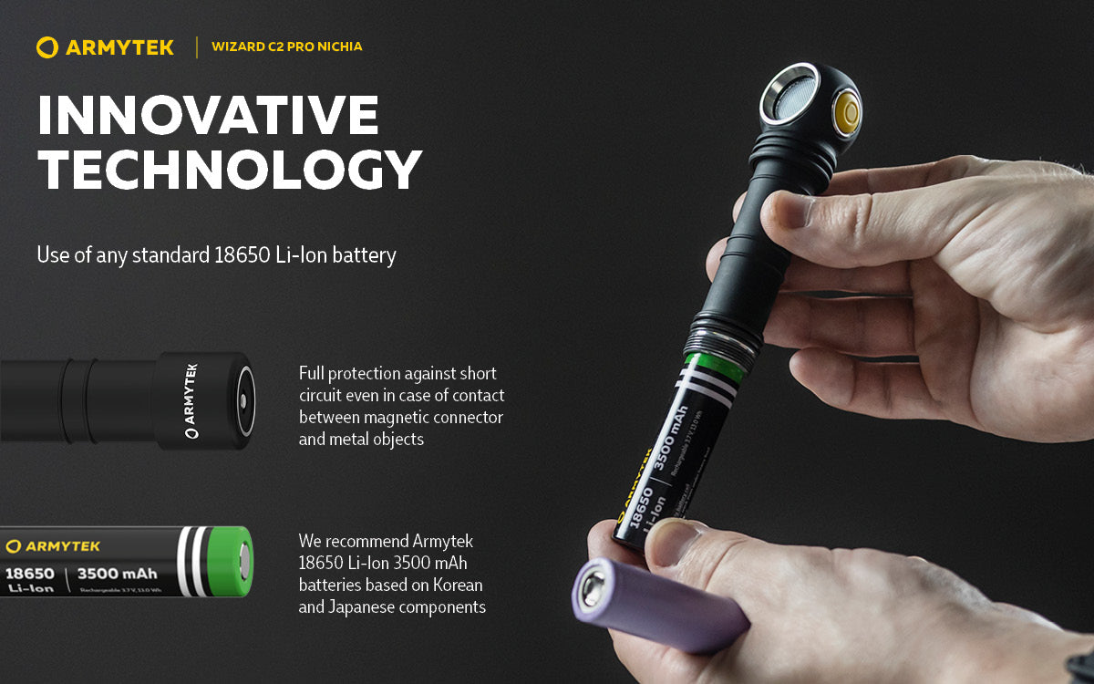 - Innovative technology allows using any 18650 Li-Ion batteries with 10A discharge current and provides full protection against short circuit even in case of contact between magnetic connector and metal objects.
