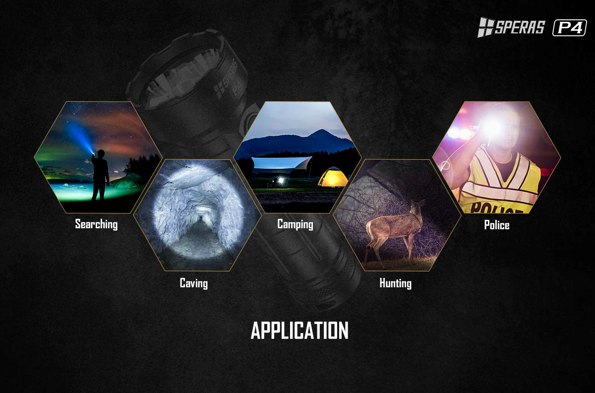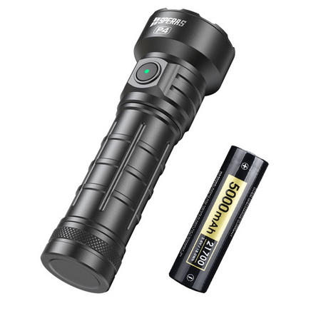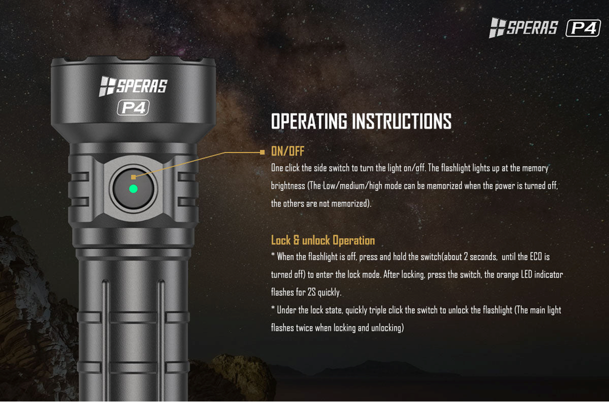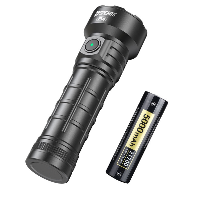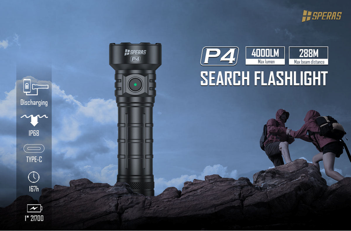 The SPERAS P4 is a powerful, rechargeable, side-switch LED flashlight 3 imported OSRAM LEDs. Powered by single 21700 lithium battery (5000mAh), it could reach to 4000 lumens and up to 288 meters. Users can switch between the 7 brightness settings under the humanized operation UI. With the compact size and functional user interface, it’s an ideal flashlight for searching, rescue and other outdoor activities. With the Lockout function, users can be assured that the flashlight will not unintentionally power on in the pocket or bag.
