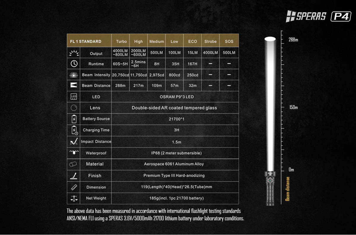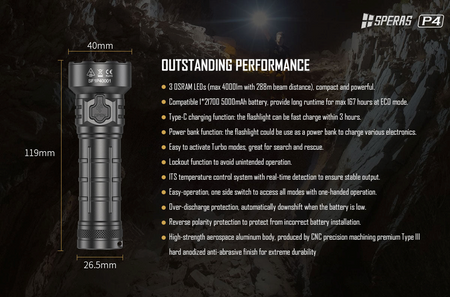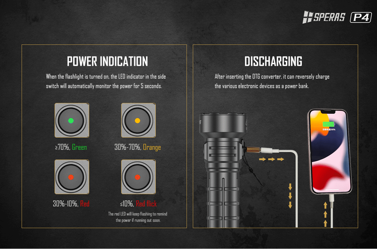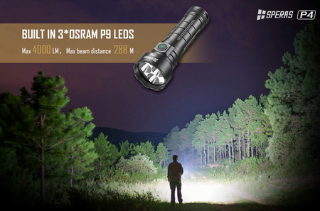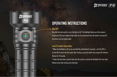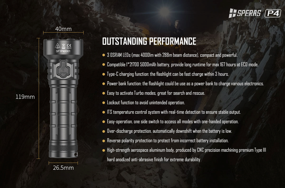 The SPERAS P4 is a powerful, rechargeable, side-switch LED flashlight 3 imported OSRAM LEDs. Powered by single 21700 lithium battery (5000mAh), it could reach to 4000 lumens and up to 288 meters. Users can switch between the 7 brightness settings under the humanized operation UI. With the compact size and functional user interface, it’s an ideal flashlight for searching, rescue and other outdoor activities. With the Lockout function, users can be assured that the flashlight will not unintentionally power on in the pocket or bag.