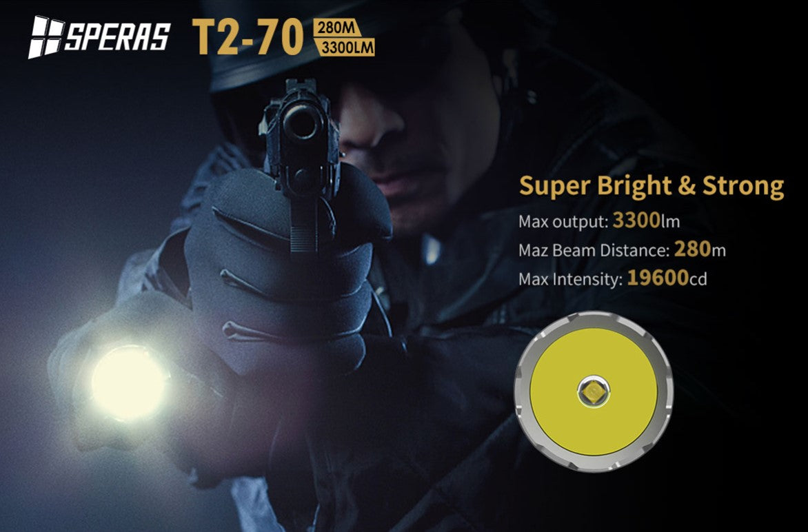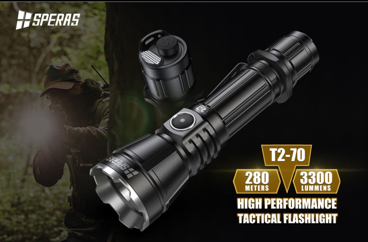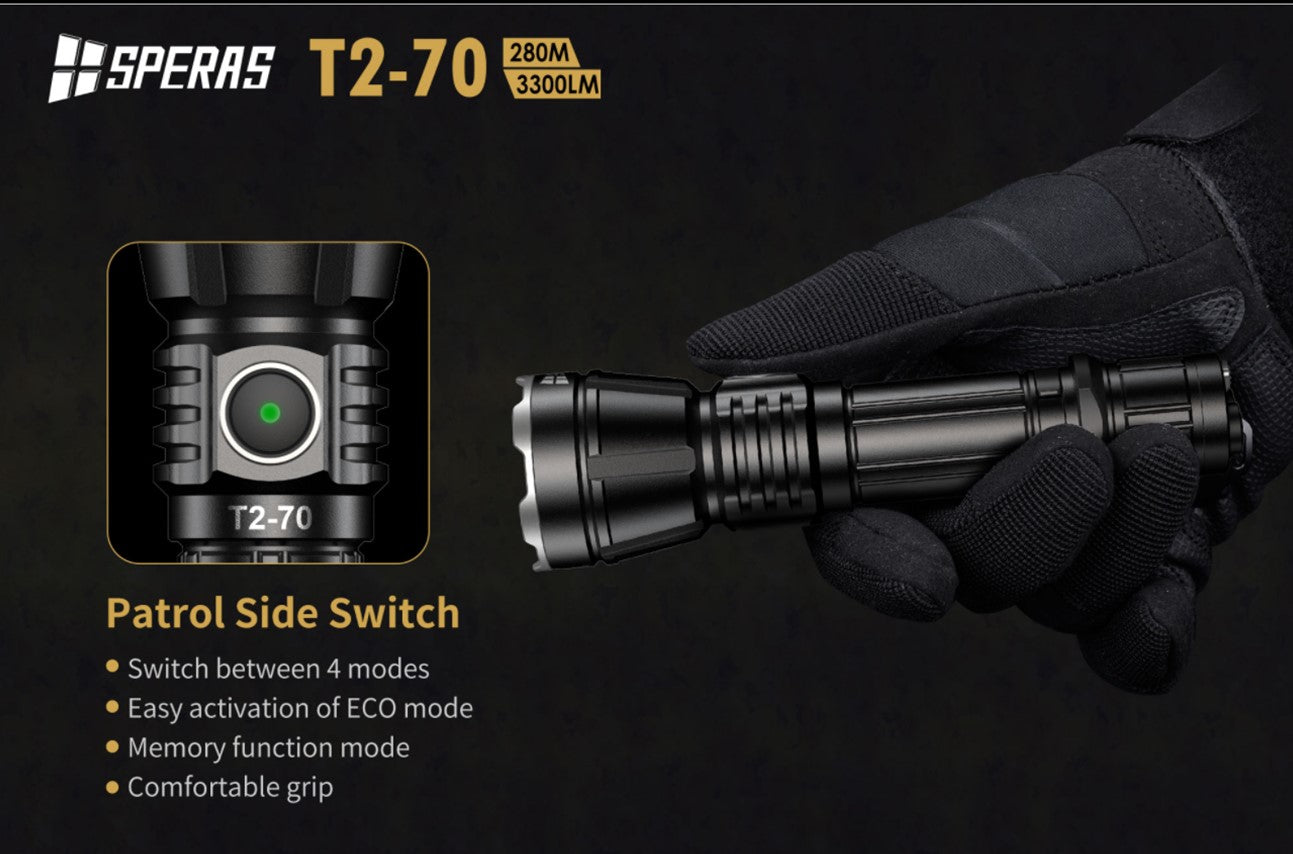 The SPERAS T2-70 is a high performance tactical flashlight with max output 3300lm and a 280-m beam distance utilizing a Cree XHP70 LED chip and a high efficiency circuit (95%). The innovative dual tail switch makes it easy to activate the one-touch turbo or one-touch strobe functions, thus ensuring the correct required mode under a stressful situation. While in the ON state the tail side switch makes it easy to change the output mode with one hand. The Patrol side switch makes it simple to change the output modes with the mode memory function as well as a built-in battery indicator. Powered by 1*18650 0r 2*CR123A battery, it is an essential flashlight for tactical applications, like: law enforcement, security & defense, search & rescue, exploration & hunting.