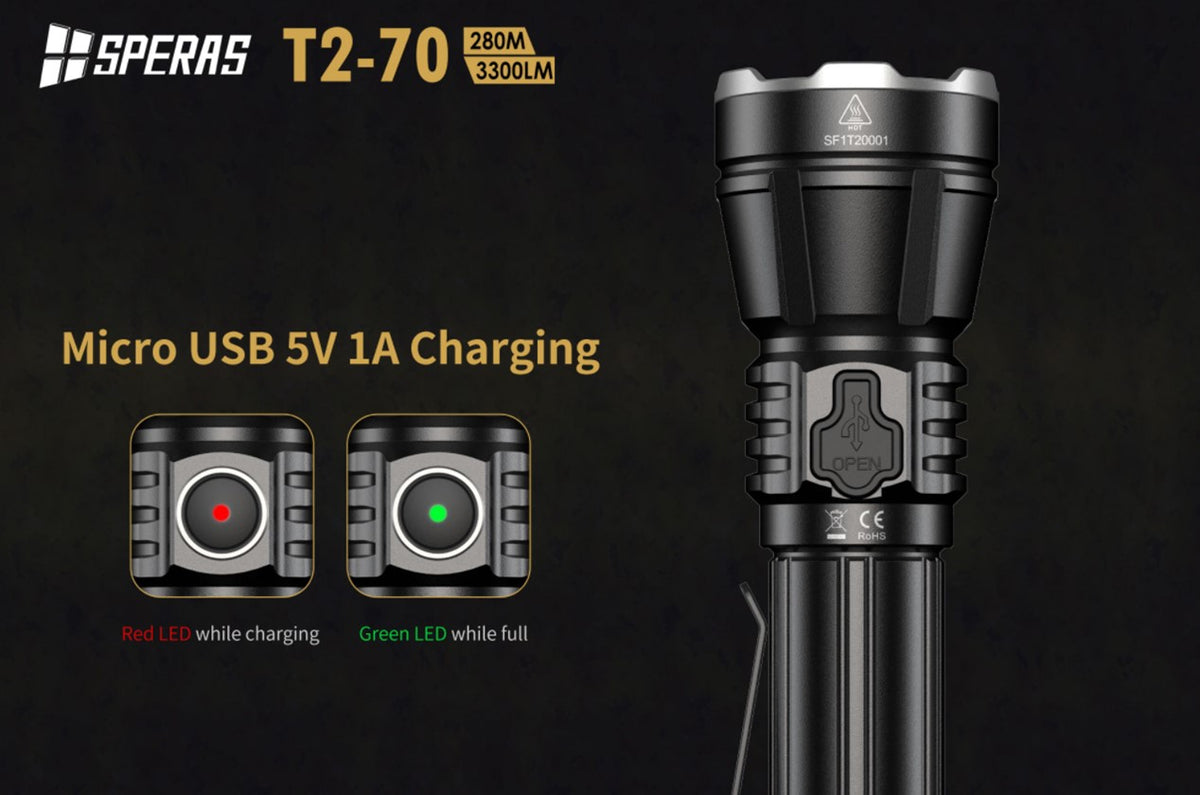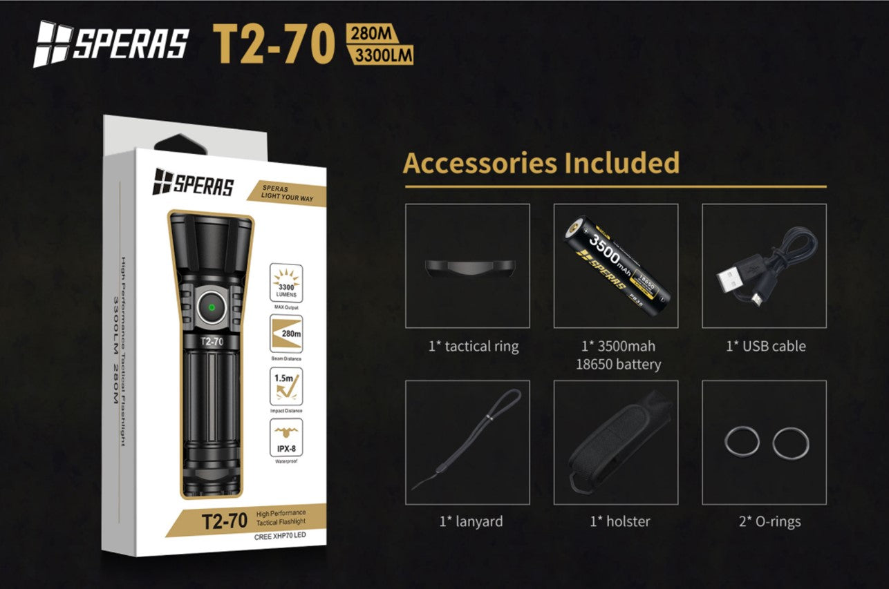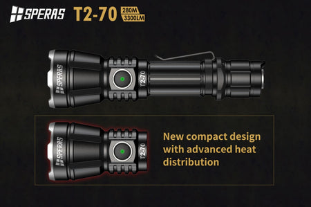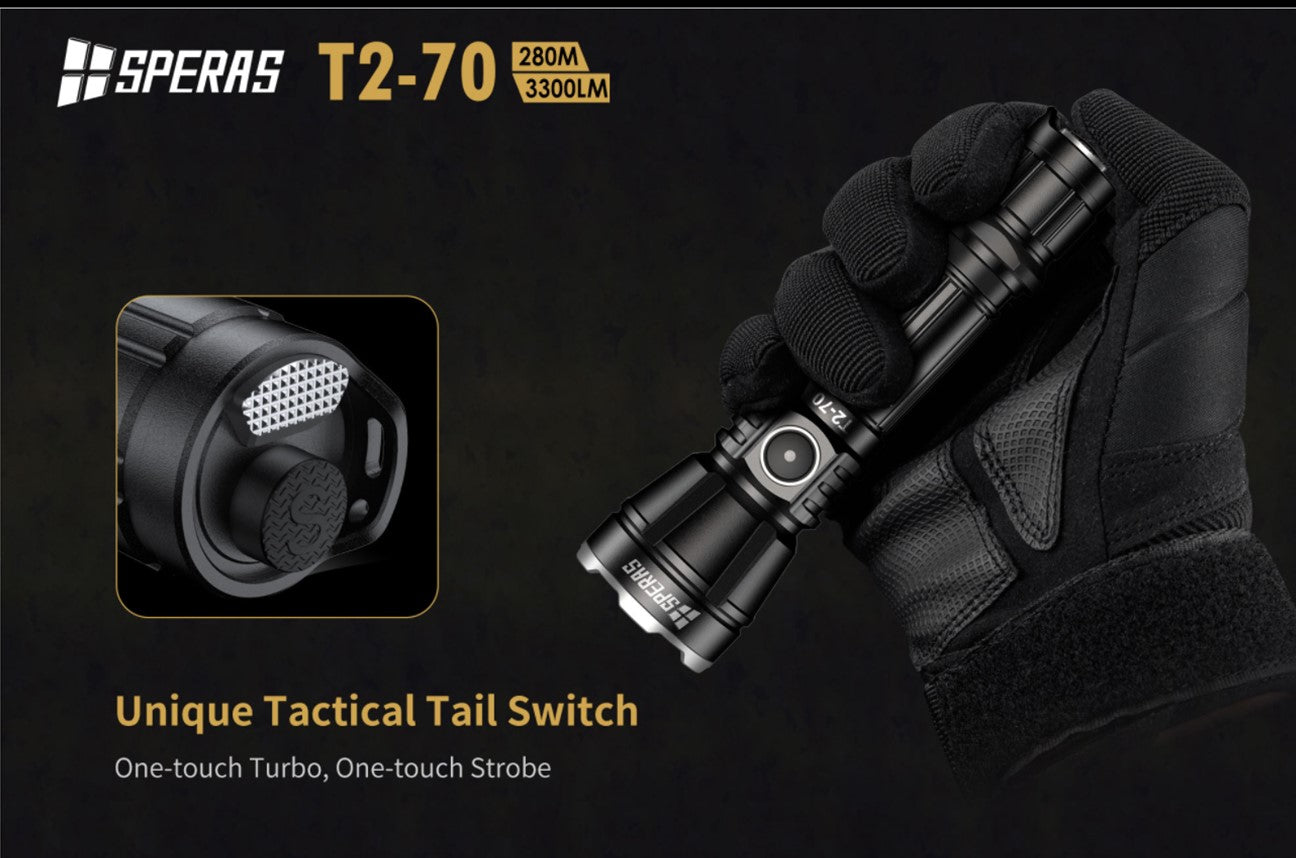 The SPERAS T2-70 is a high performance tactical flashlight with max output 3300lm and a 280-m beam distance utilizing a Cree XHP70 LED chip and a high efficiency circuit (95%). The innovative dual tail switch makes it easy to activate the one-touch turbo or one-touch strobe functions, thus ensuring the correct required mode under a stressful situation. While in the ON state the tail side switch makes it easy to change the output mode with one hand. The Patrol side switch makes it simple to change the output modes with the mode memory function as well as a built-in battery indicator. Powered by 1*18650 0r 2*CR123A battery, it is an essential flashlight for tactical applications, like: law enforcement, security & defense, search & rescue, exploration & hunting.