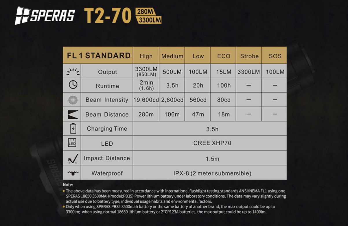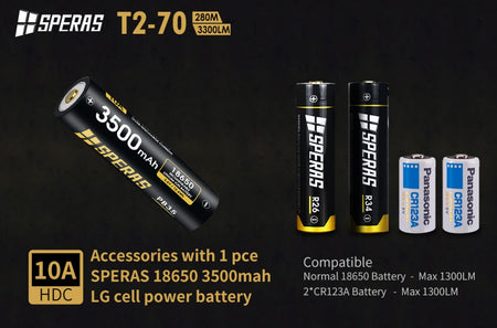 | Compatible Battery | 1* 18650 battery/2*CR123A battery, we kindly suggest to use SPERAS PB35 battery(10A HDC) |