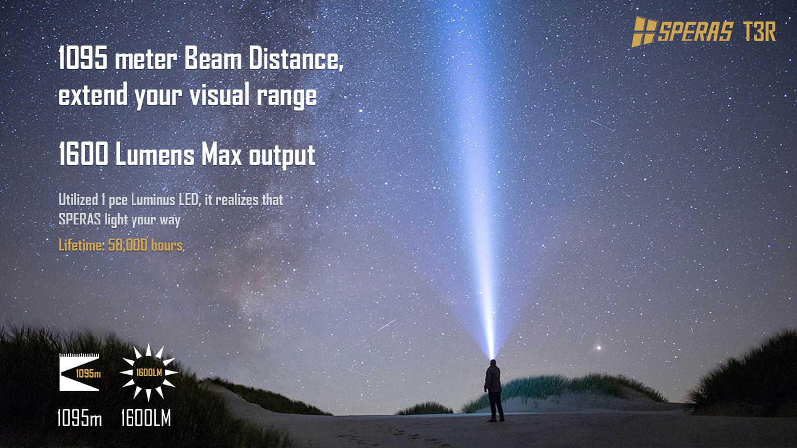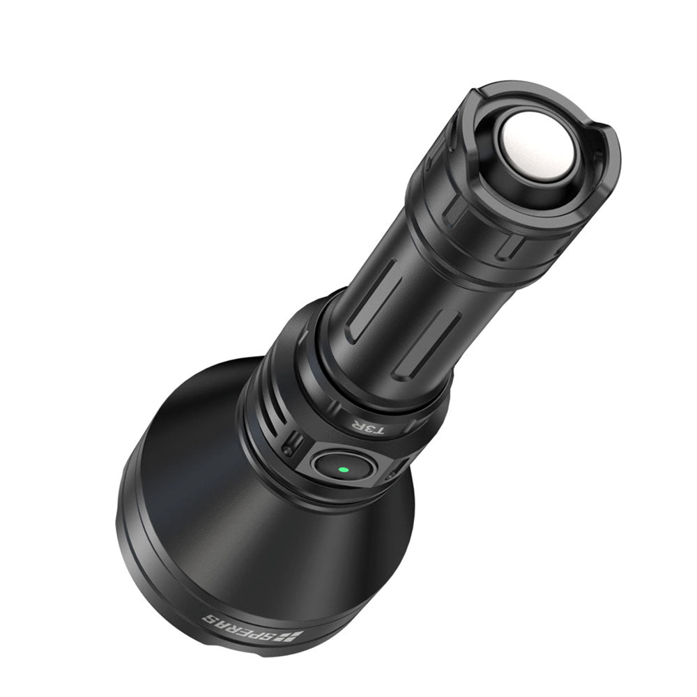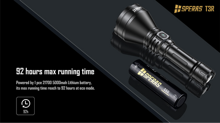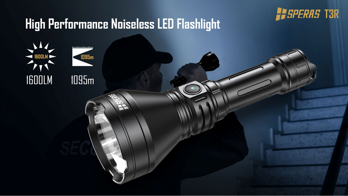 The Speras T3R is an innovative noiseless “thrower”. Despite its compact size it can reach a maximum throw of 1095 meters with its output of 1,600 lumens. This together with a maximum run time of 92 hours makes it an excellent high performance flashlight for hunting, outdoor, search and rescue, etc. Great light overall, very comfortable when handling.