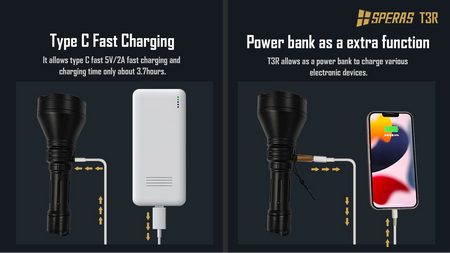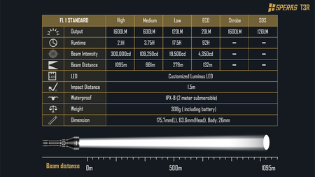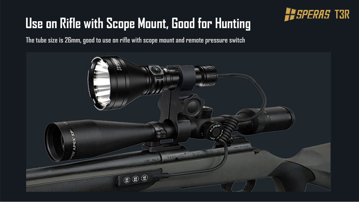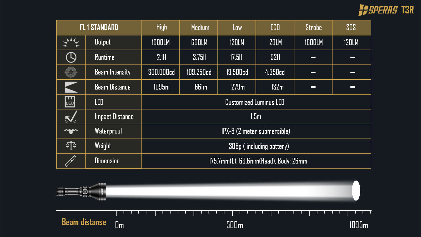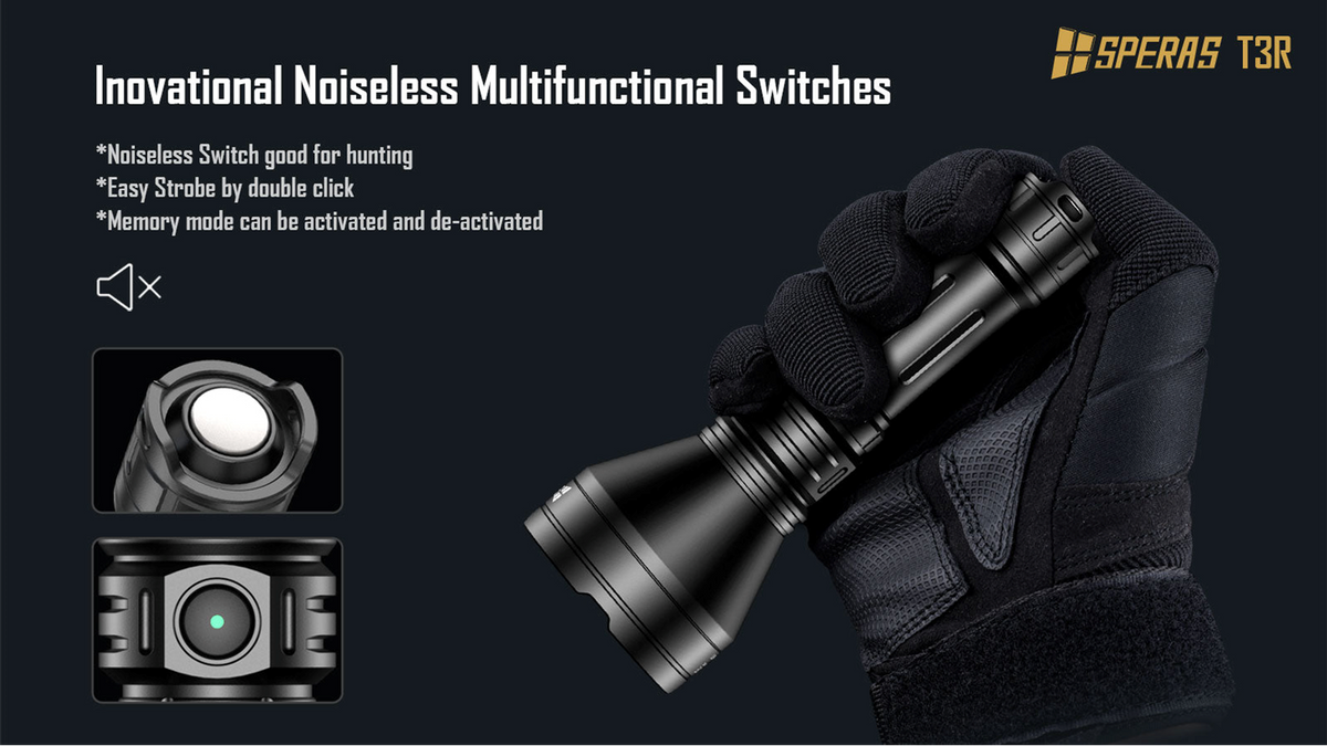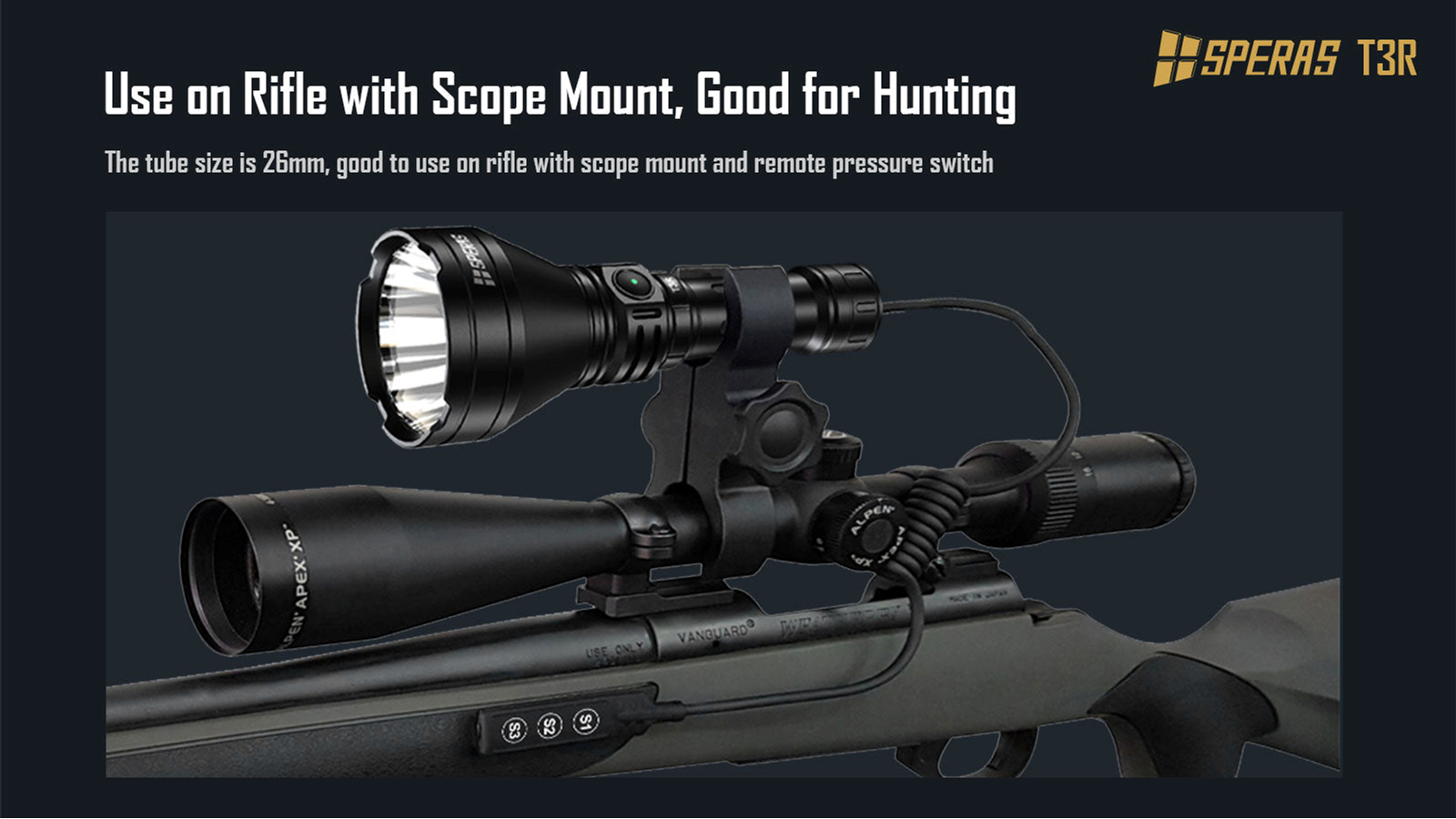 The Speras T3R is an innovative noiseless “thrower”. Despite its compact size it can reach a maximum throw of 1095 meters with its output of 1,600 lumens. This together with a maximum run time of 92 hours makes it an excellent high performance flashlight for hunting, outdoor, search and rescue, etc. Great light overall, very comfortable when handling.