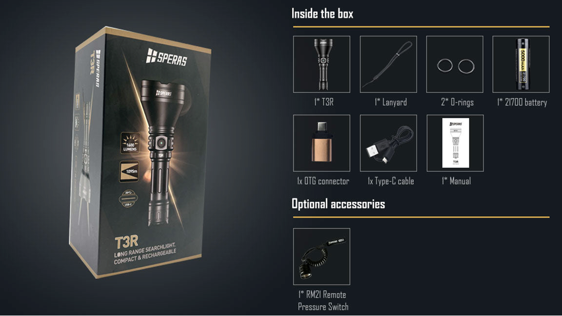 1* T3R flashlight (1x 21700 battery 5000mah) 1* holster 2* O-ring 1* Lanyard 1* OTG connector 1* manual |