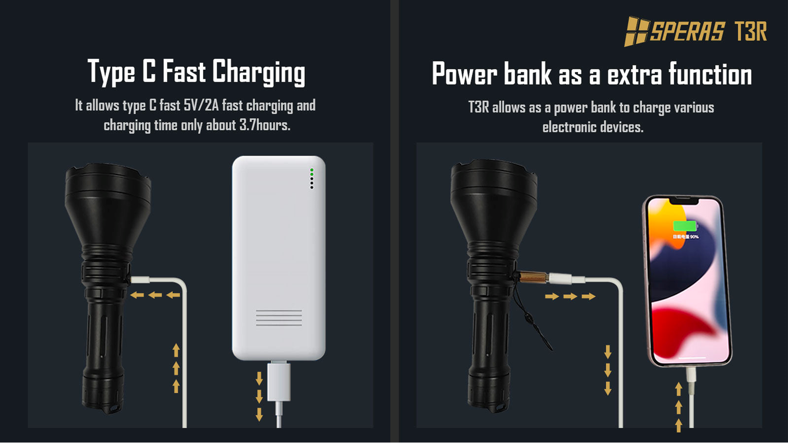 - Type C charging and functionality to use as a power bank to charge various electronic devices.
