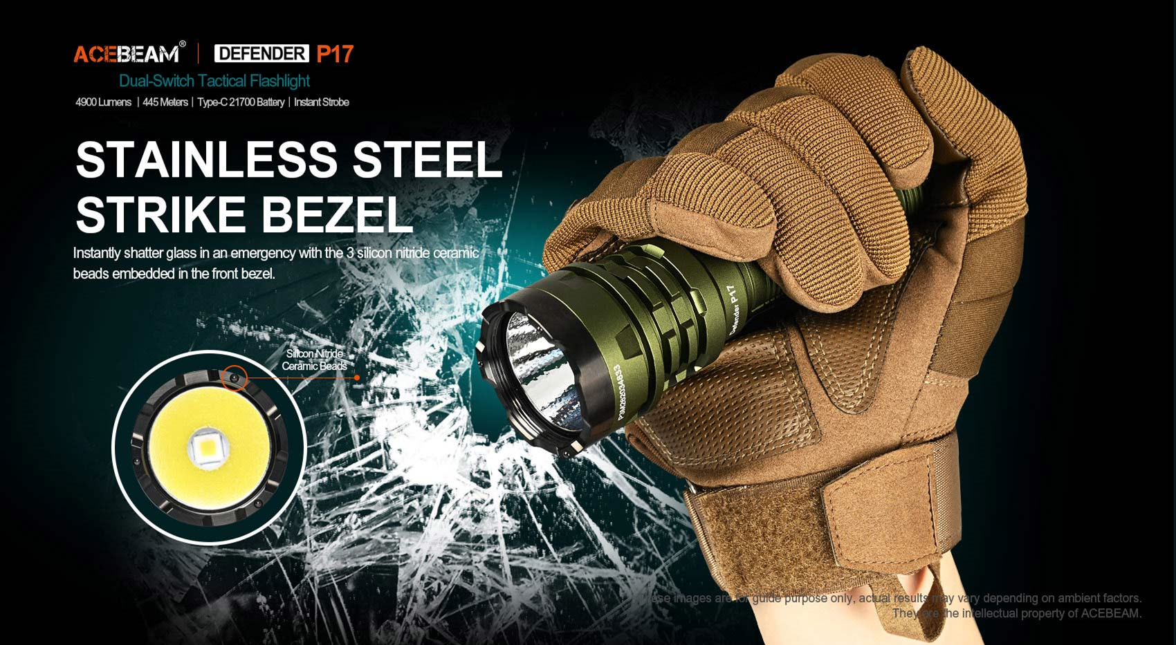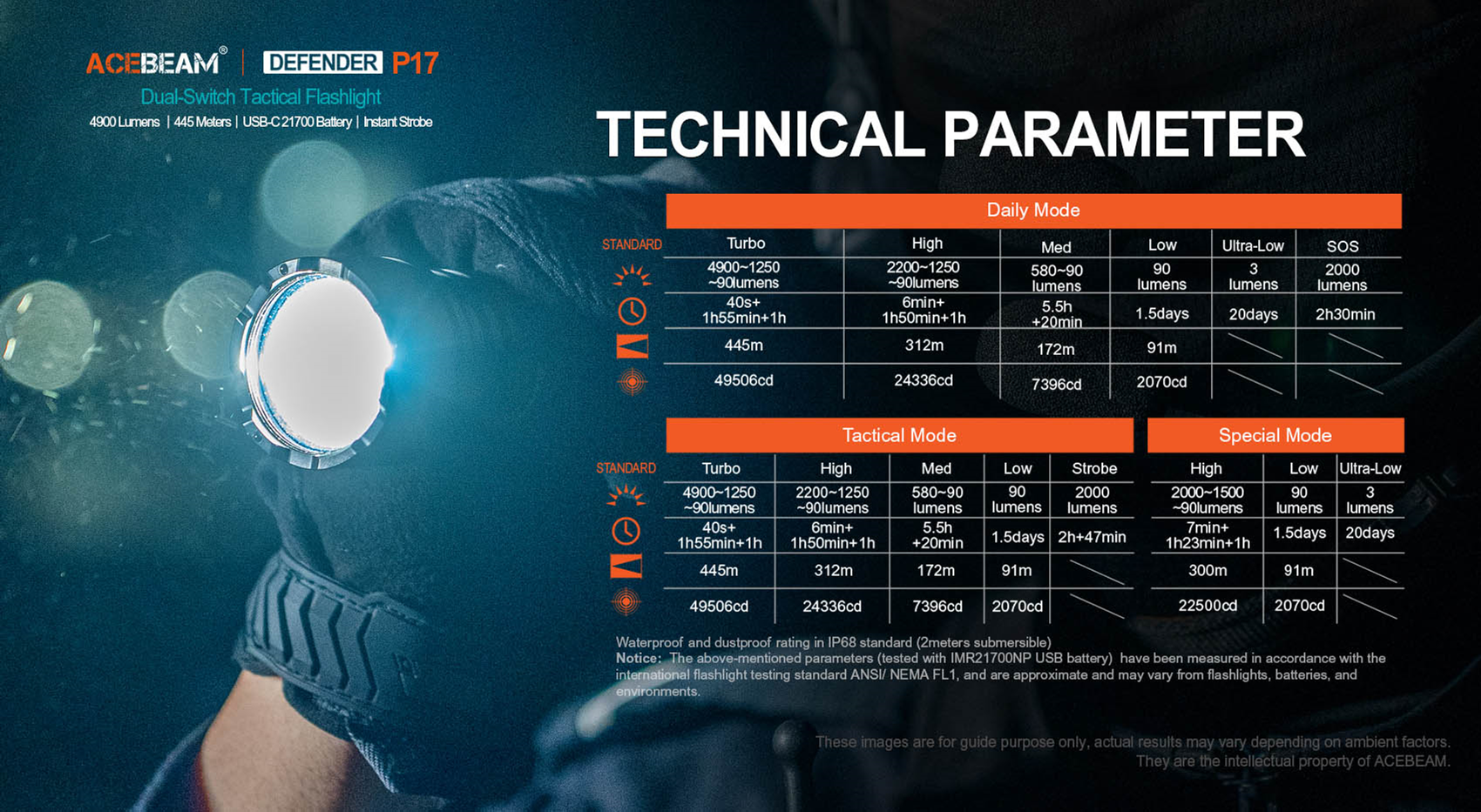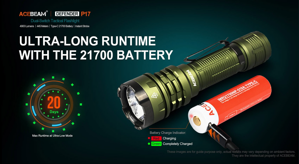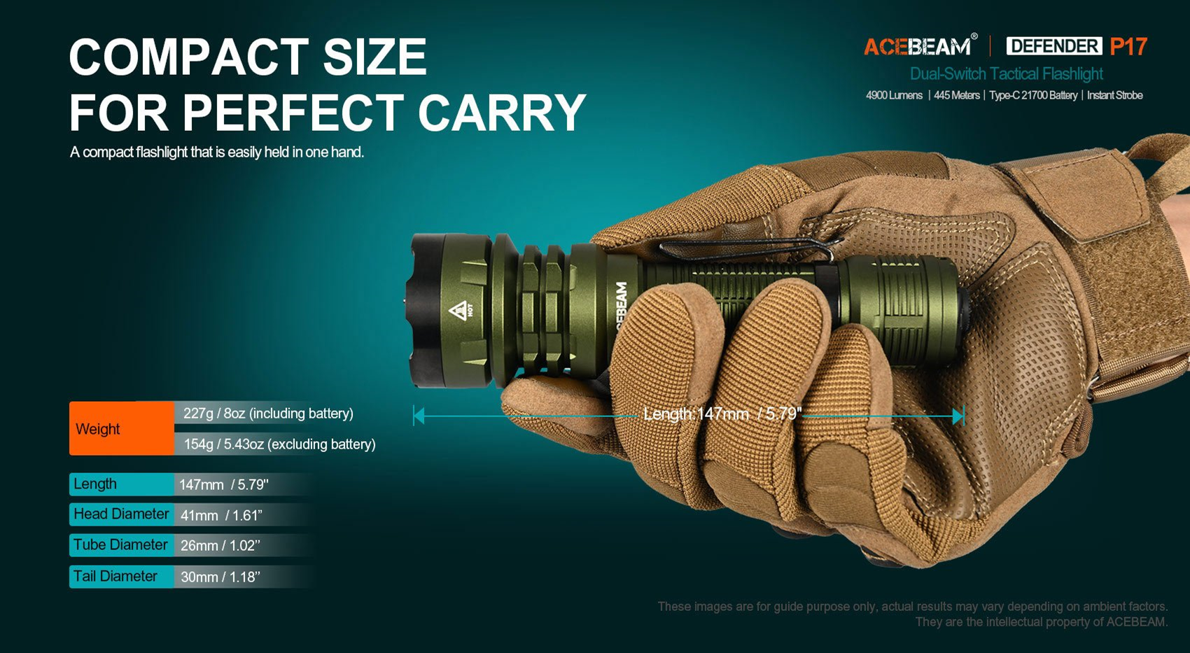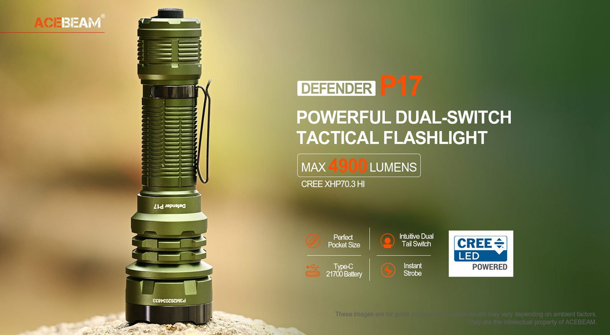 The Acebeam P17 Defender remains a a true warrior, appealing lighting tool to accomplish important missions. Look no further than the Defender P17 tactical flashlight, a stylish-looking lighting companion that will aid you in your next task. Let "tactical flashlight" truly live up to its name which makes the difference between success and failure in vital situations requiring lighting. Boasting a maximum output of 4900 lumens and a beam length of 445 meters (1459 ft), it utilizes a CREE XHP70.3 HI LED and has a tail-dual-switch design that enables easy operation with one-click activation of high brightness. The switches are intuitively fashioned, you can click the tactical switch to start a mission, and cycle through modes by clicking the functional switch, granting you comprehensive preparedness for everyday and tactical applications alike. With a rechargeable 21700 battery, this flashlight has an ultra-long runtime of 20 days. An ideal tool for hunting, search and rescue, law enforcement, and outdoor activities.
