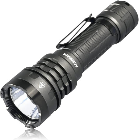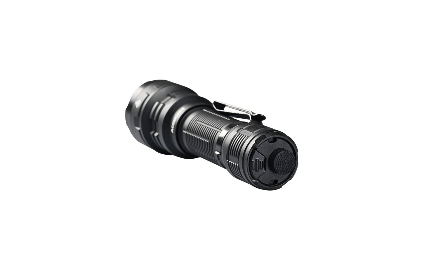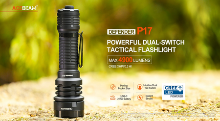 The Acebeam Defender P17 specifically designed for tactical and defense use. With a Dual tactical tail switch, the flashlight starts immediately in the ultra-Low, Turbo, and Strobe. This flashlight has a powerful LED that generates dazzling white light. The maximum light output is 4900 lumens. The reflector provides a beam distance of 445 meters. With the Defender P17, you have a truly reliable flashlight in your hands.