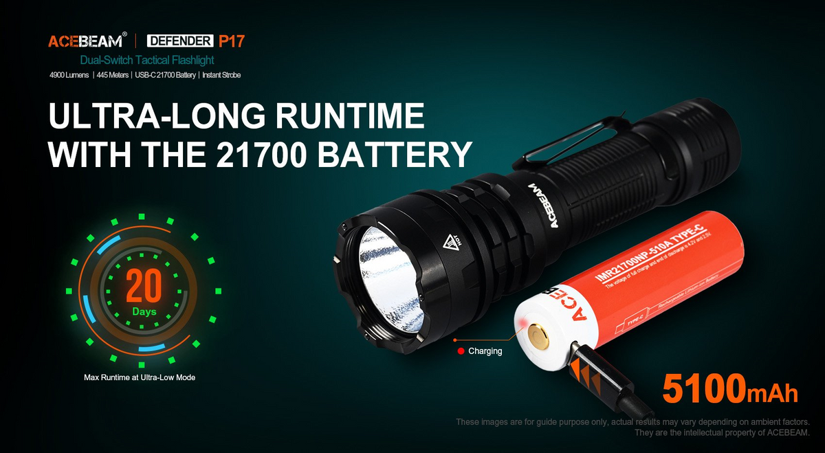 - Included an Acebeam 21700 5100mAh rechargeable Li-ion battery with Built-in USB Type-C Port (IMR21700NP-510A).