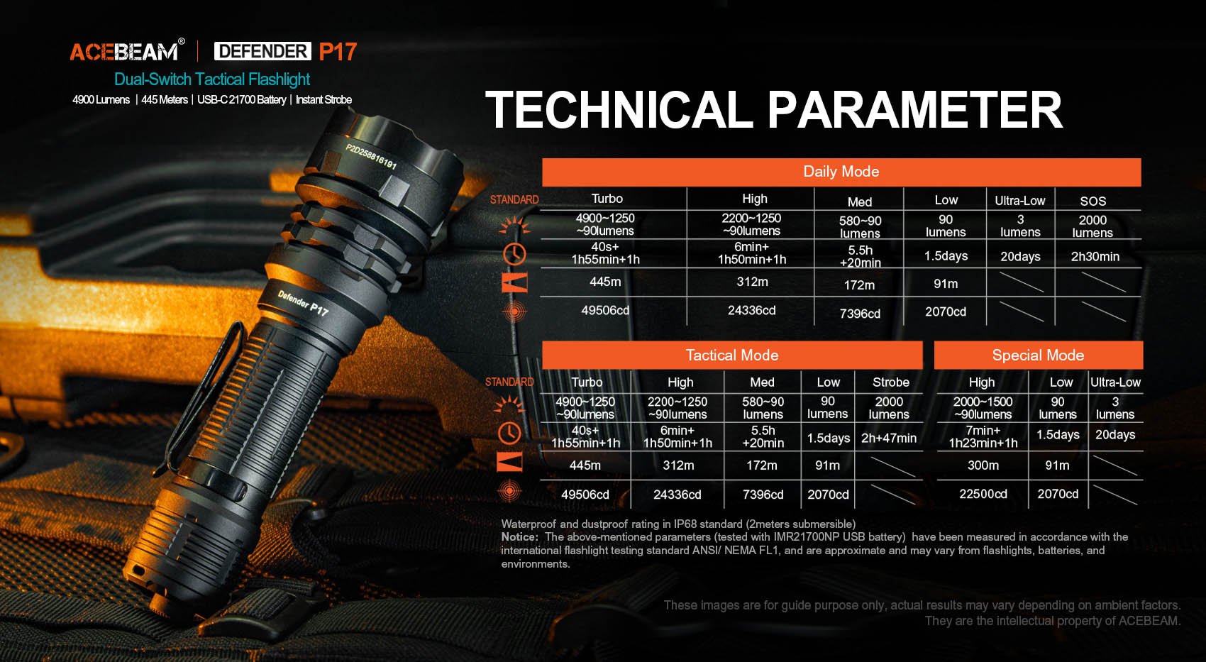 The Acebeam Defender P17 Sand is a Limited Edition high-performance streamlined tactical flashlight with 4,900-Lumen. Its aluminum-alloy housing has a scratch and corrosion-resistant gray anodized finish. A CREE XHP70.3 HI LED casts an amazing brightness range between 3 and 4,900 lumens across five intensity levels as well as auxiliary strobe and SOS modes, granting you comprehensive preparedness for everyday and tactical applications alike. At its maximum brightness, the P17 allows you to identify friend or foe over 1,400 feet away. One Daily and two Tactical modes give you full control over the comprehensive capabilities this powerhouse has to offer.