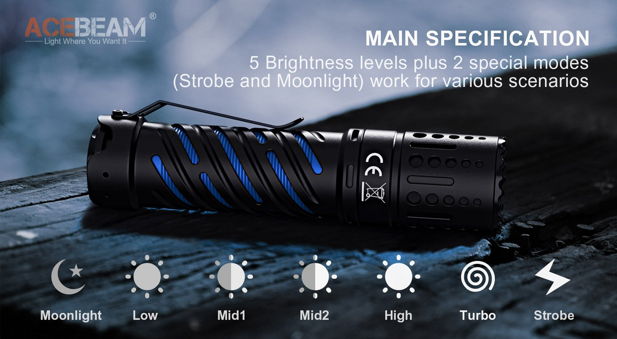 - 5 Brightness levels and 2 special modes (Strobe and Moonlight) for various scenarios