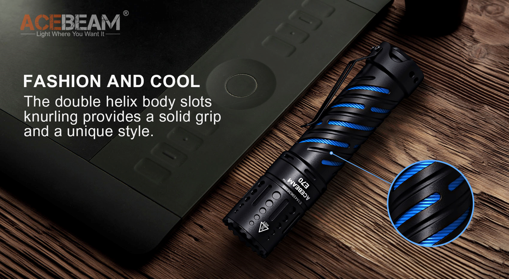 The Acebeam E70 is the most beautiful-looking pocketable EDC flashlight praised by customers. The double-inner barrel hollow design, stylish, full texture, but also improve the heat dissipation efficiency and effectively isolate the heat of the barrel. The unique featured lockout design prevents accidental activation for your safety consideration. This is an aesthetically pleasing and very bright flashlight for the first selection as the "most beautiful flashlight gift".