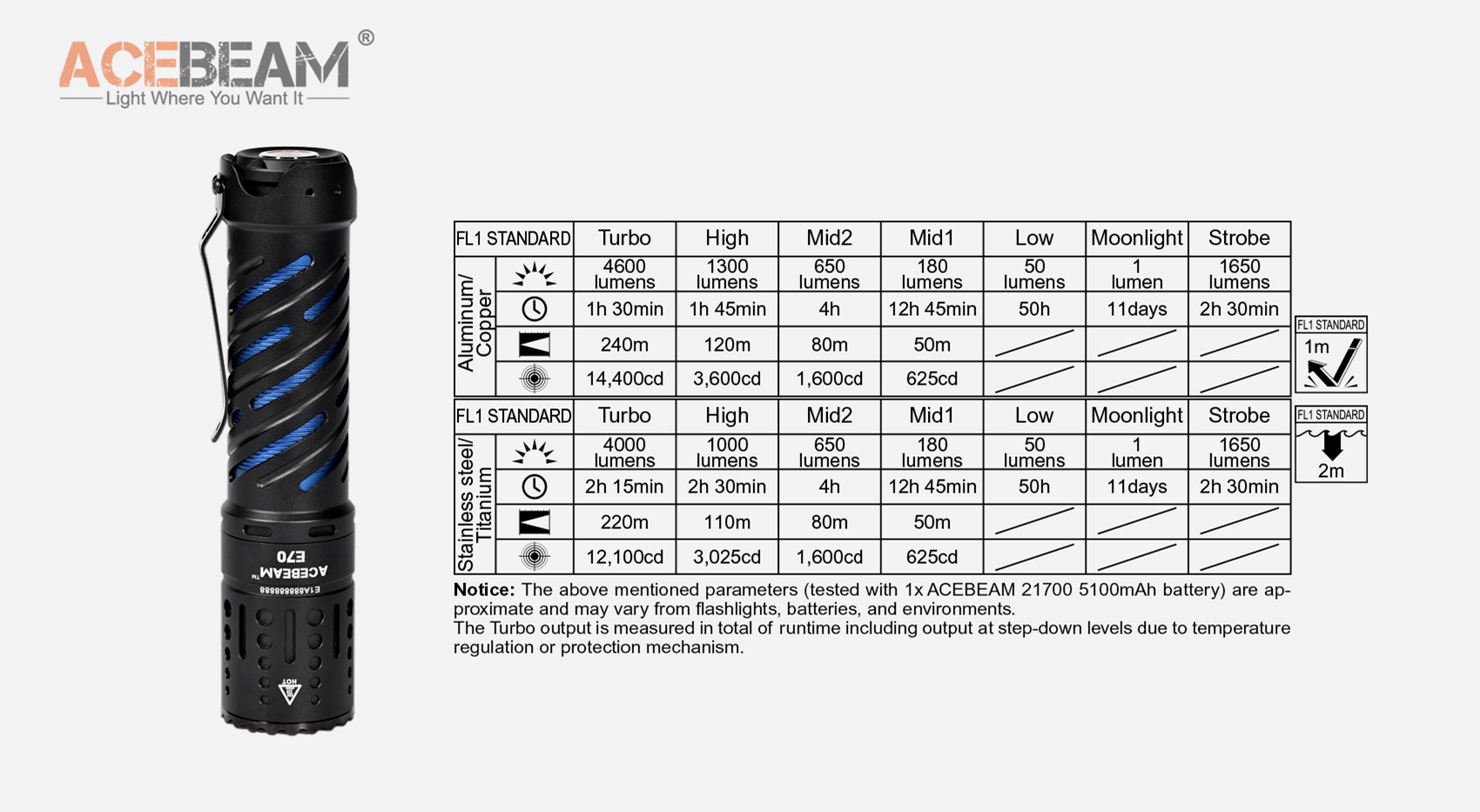 - Turbo: 4,600 lumens; 14,400cd; 240 meters; 1 hours 30 minutes