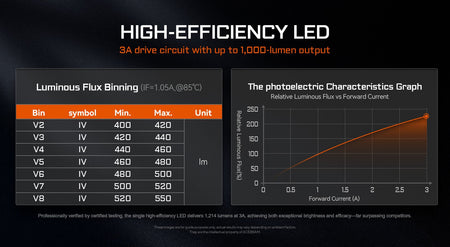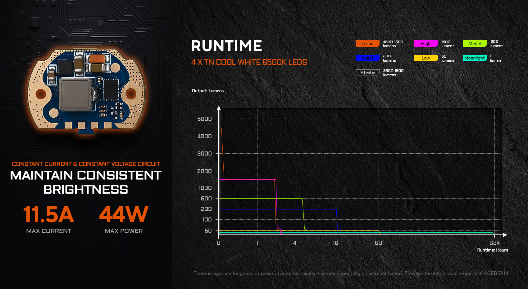 - Turbo: 4000 ~ 1400 lumens; 48400cd; 440 meters; 1 minute + 1h40min