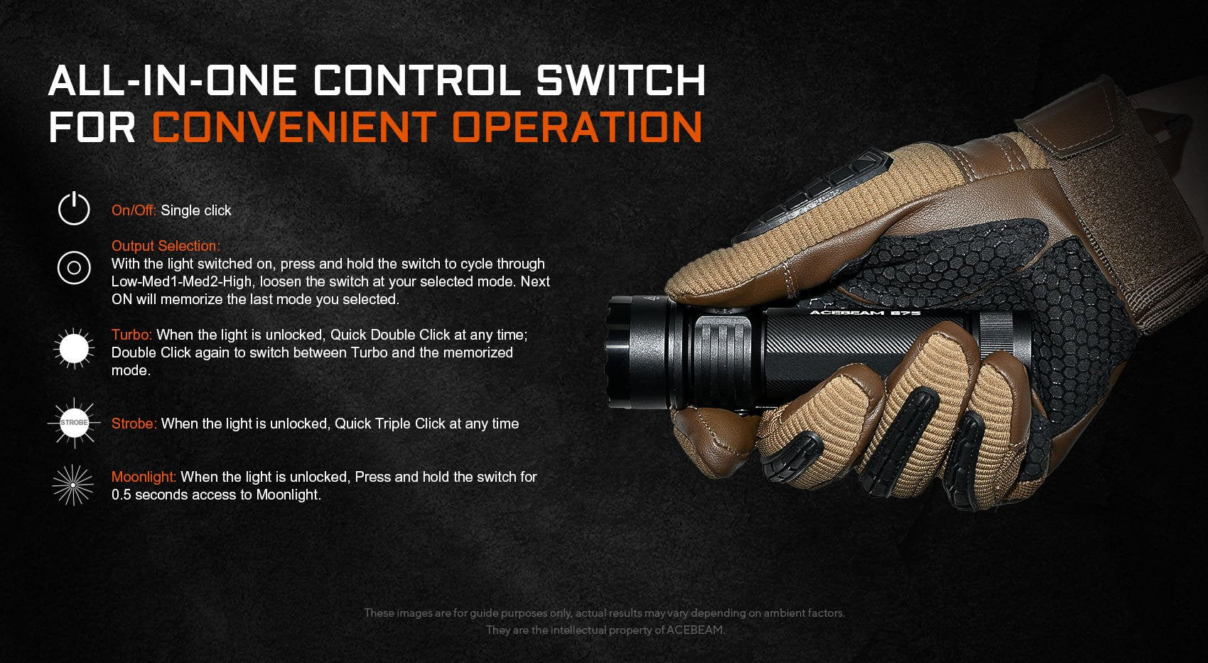 - The single side switch controls six lighting modes including a strobe mode for emergencies