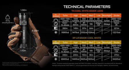 - Turbo: 4500 ~ 1500 lumens; 16900cd; 260 meters; 1 minute + 1h45min