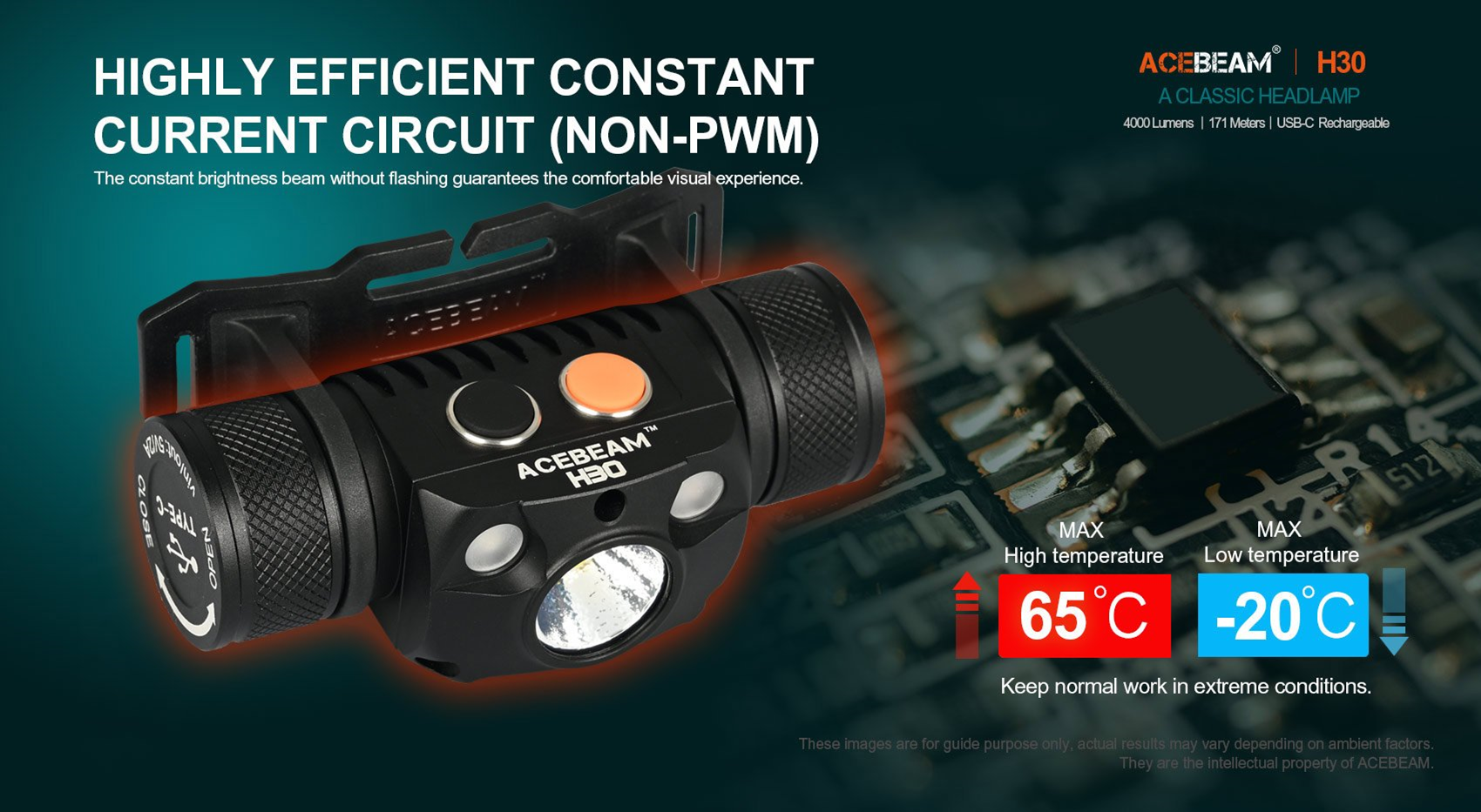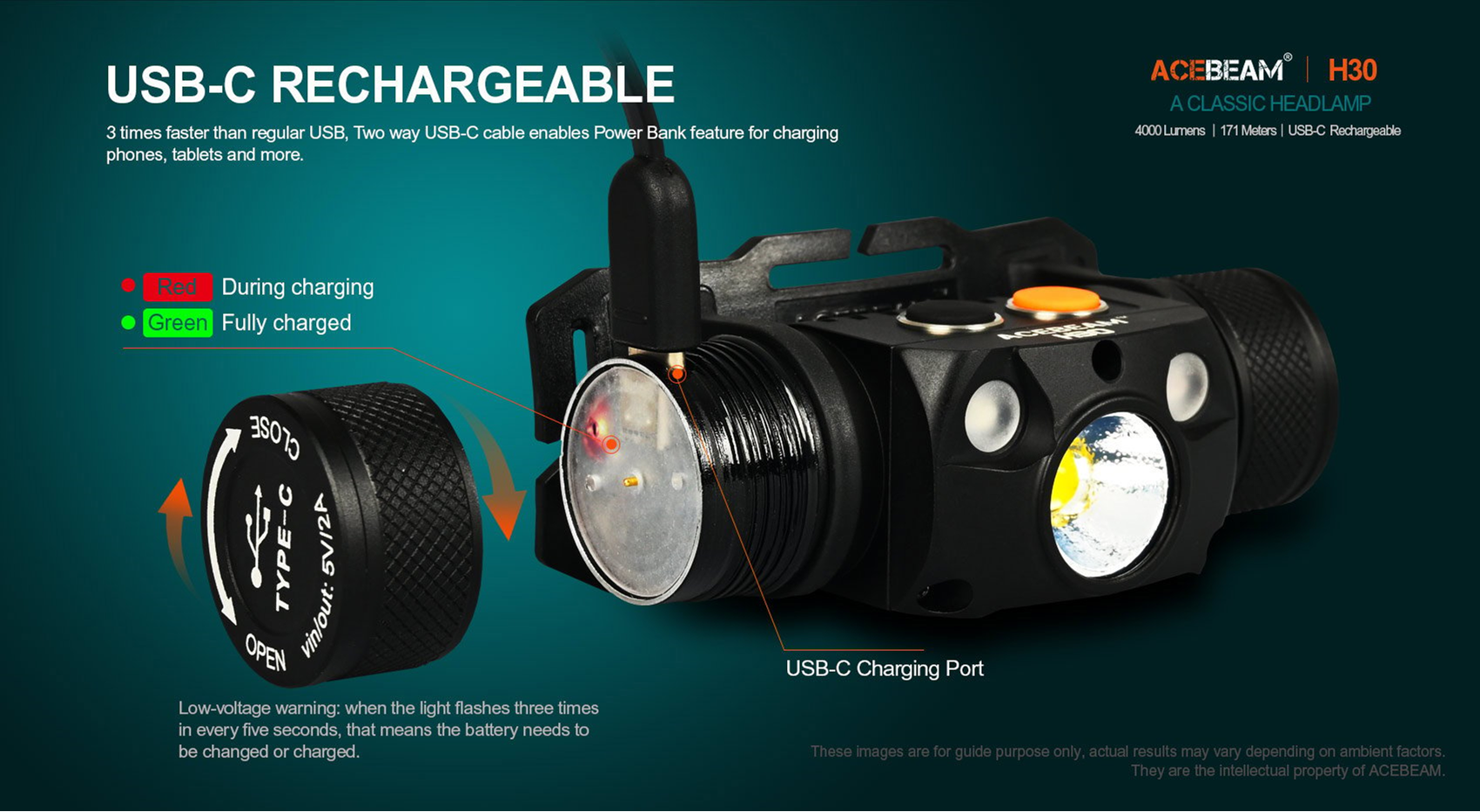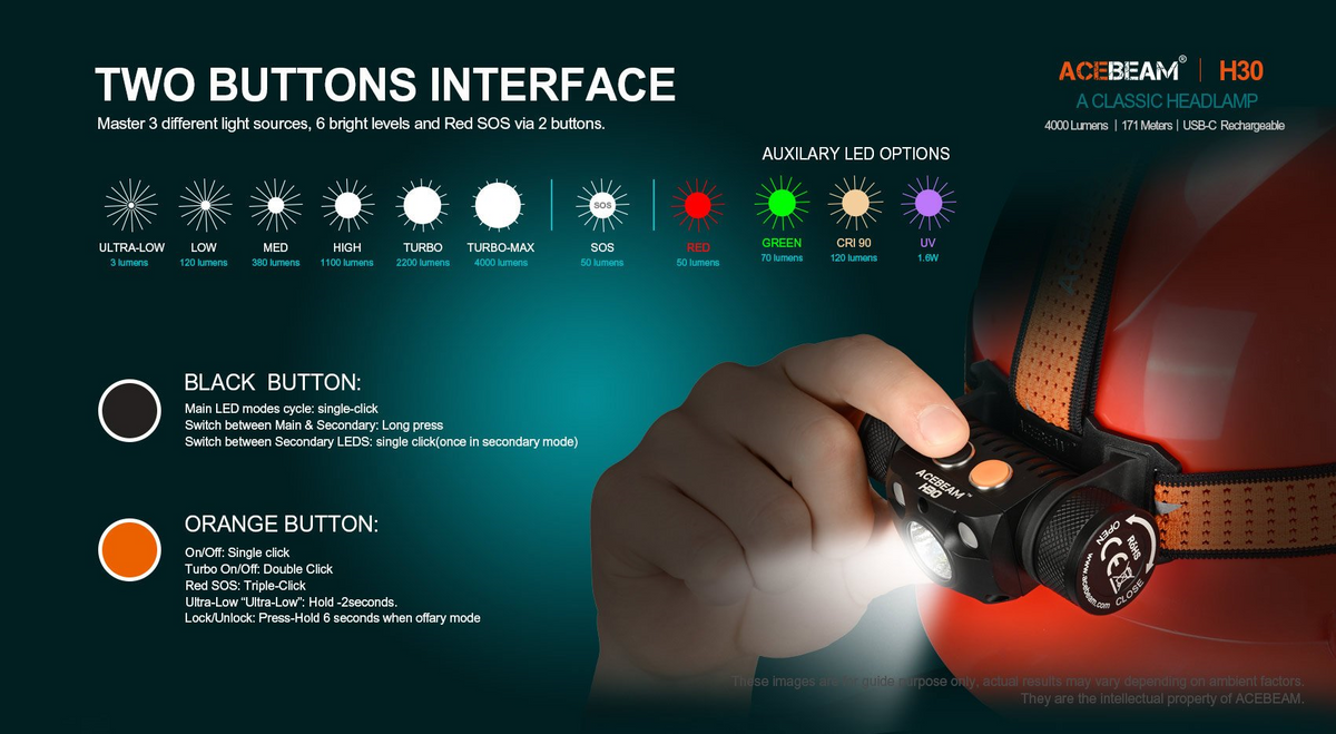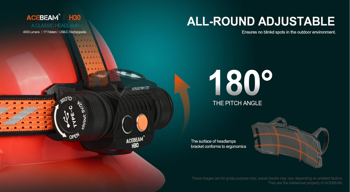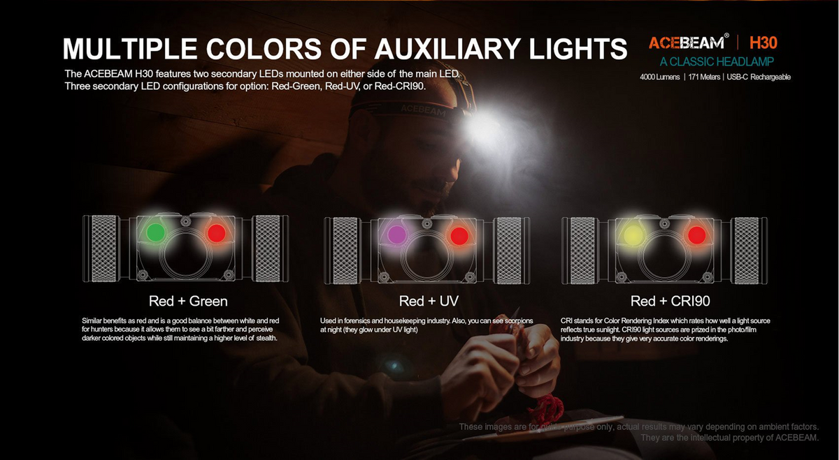 The AceBeam H30 is one of the brightest LED headlamps on the market driven by a single 21700 battery. Suitable for mining, exploration and outdoor search, the secondary LED options of Red+Green, Red+UV, and Red+ CRI are available to enrich your application scenarios. Red LED preserves your night vision; UV for police and crime scene investigators; CRI light has the ability to present the original color of the light source to achieve better lighting effects.