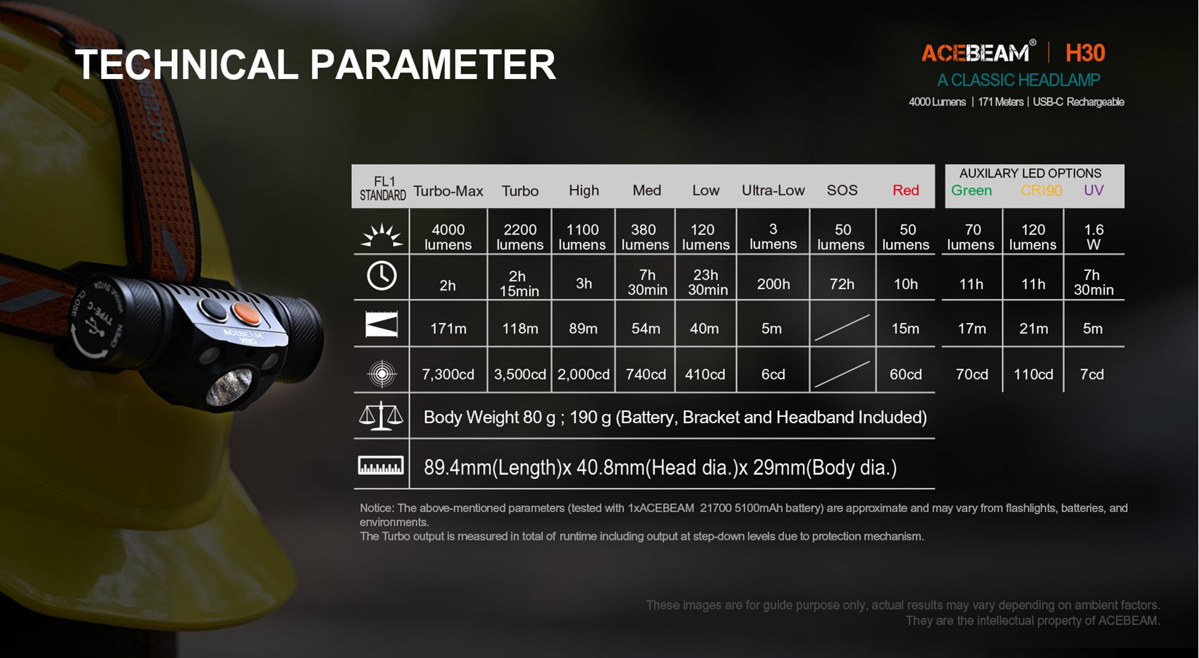 - Weight: 80g excluding battery; 151.5g including 1x21700 battery (IMR21700NP-510A); headband with silicone holder 38.8g