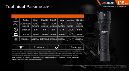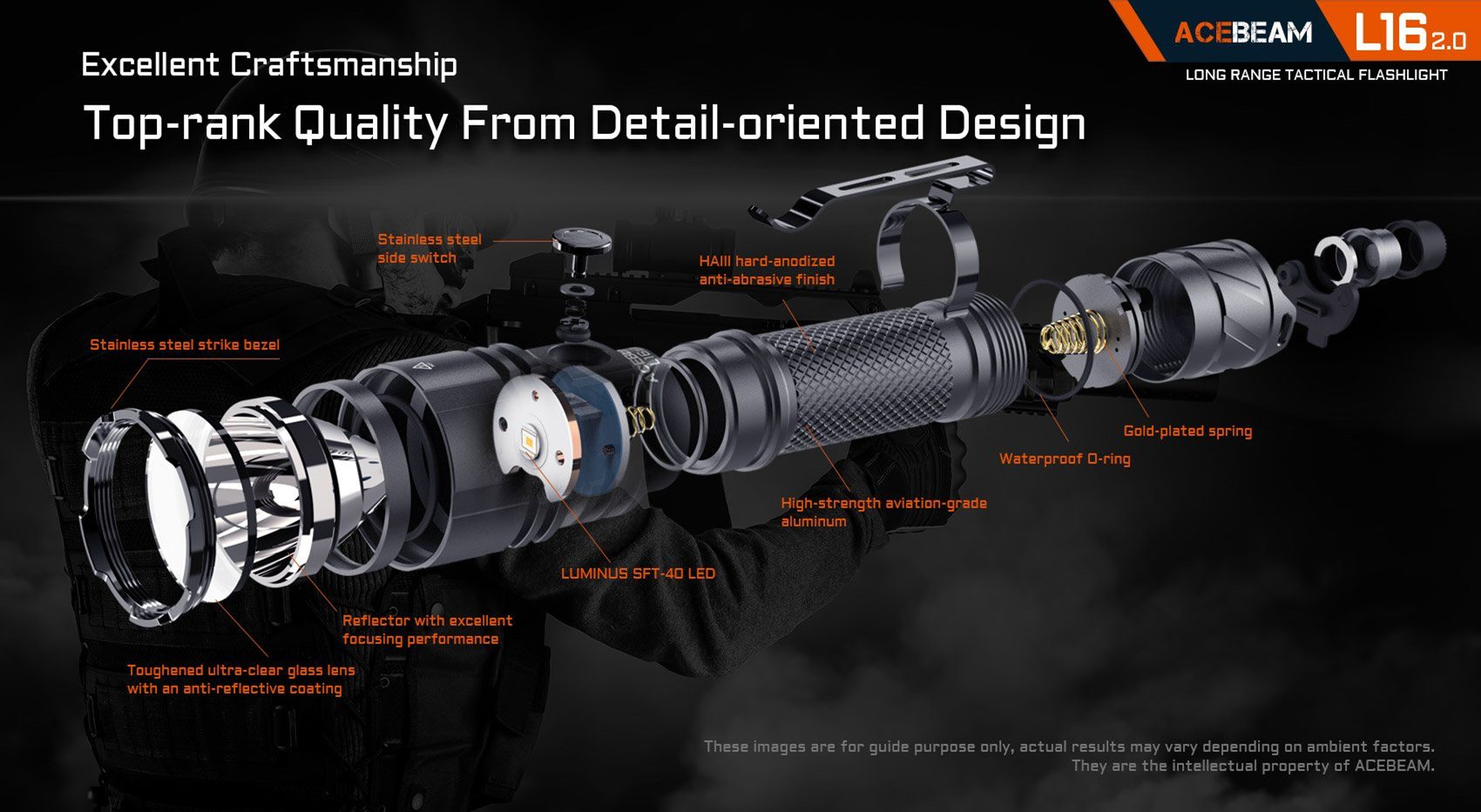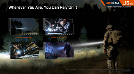 The Acebeam L16 2.0 is an upgraded version of the L16, designed as a long-range tactical flashlight aimed at providing professional users with enhanced performance and greater ease of use. Featuring an original Luminus SFT-40 LED, it delivers a maximum output of 2100 lumens and a beam distance of up to 670 meters, ensuring clear illumination of targets even in extreme conditions. The USB-C tail switch interface allows for quick scenario switching without the need to replace the tail cap, combining charging and tail switch functionality for easier operation. Additionally, the L16 2.0 supports simultaneous use and charging, greatly outperforming its predecessor L16.