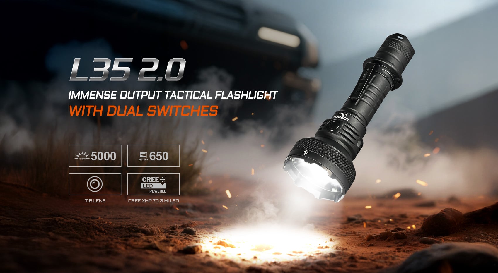 The Acebeam L35 2.0 Mecha-Style Silver Gray (Limited Edition) is a high-performance duty flashlight with CREE XHP70.3 HI LED, offering 5000 lumens and a 650-meter beam distance for long-range visibility and extended close-up use. Its rugged design features a stainless steel strike bezel and an IP68 rating, offering protection against water and dust, and making it reliable in extreme conditions, including submersion up to 5 meters. With a powerful 21700 battery, it offers up to 12 days of runtime. The dual side and tail switches allow for easy toggling between six output modes, with instant access to turbo and strobe modes. The L35 V2.0 is the perfect choice for professionals and outdoor enthusiasts, meeting all lighting needs with versatility and durability.