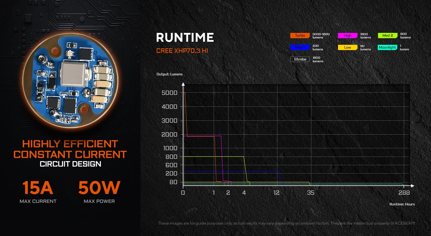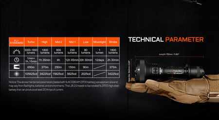 Turbo: 5000 ~ 1800 lumens; 105625cd; 650 meters; 60s + 1 hour 15 mins