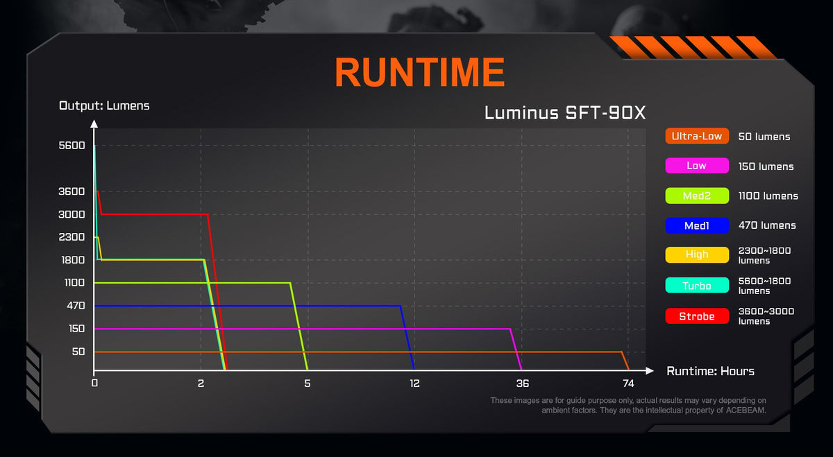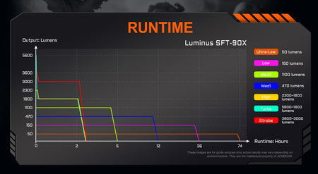 • 1 x Luminus SFT-90X LED, max output 5600 lumens, throw up to 1454 meters