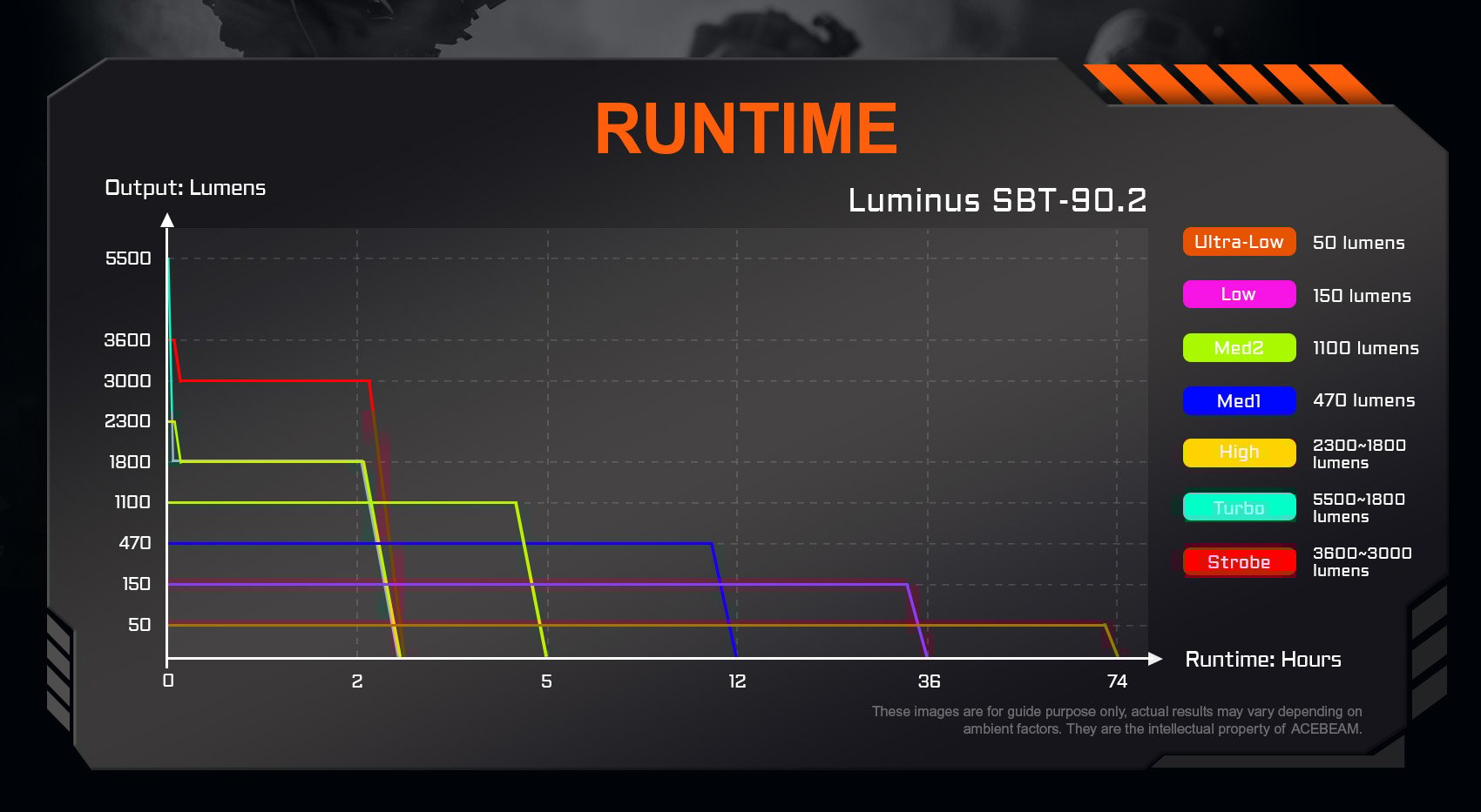 Ultra-Low: 50 lumens; 5256cd; 145 meters; 74 hours