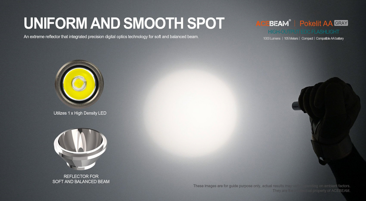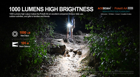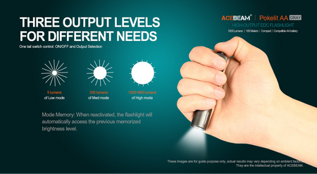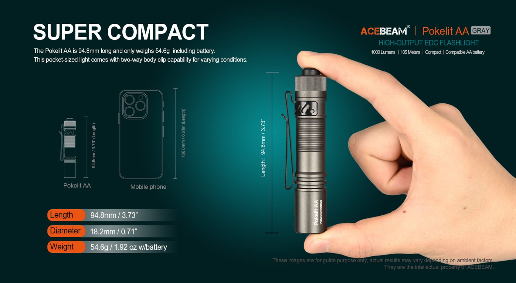 Acebeam has deeply cultivated the efficiency of LED drivers for years. Featuring one latest innovated high-efficiency LED with Acebeam's ultimate pursuit circuits design, Acebeam Pokelit AA gray emits a maximum output of up to 1000 lumens by its pocket-AA sized EDC flashlight. Waterproof to underwater 2 meters, it features dual fuel capability using a widely available AA battery or lithium battery (included). The dual-direction pocket clip makes this slim flashlight even more convenient for carrying in a pocket or attaching to a hat or strap.