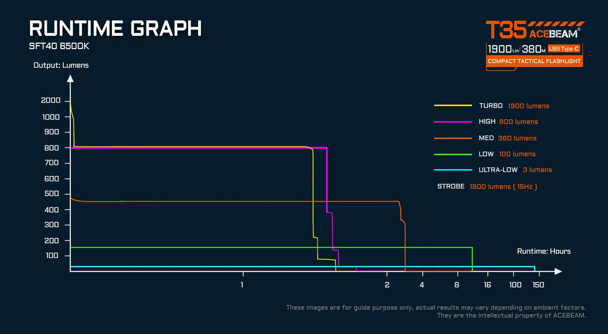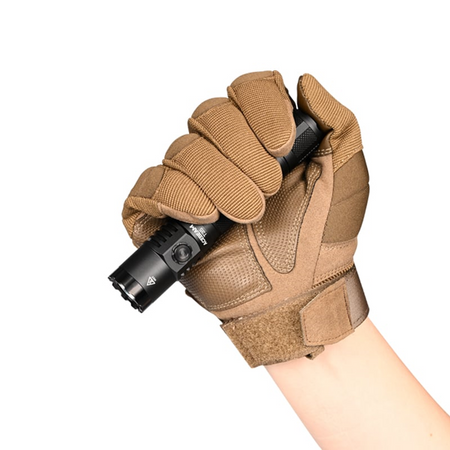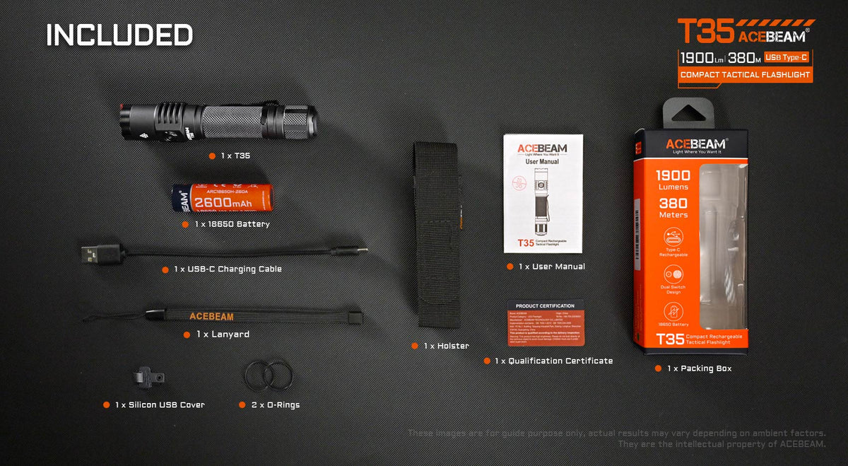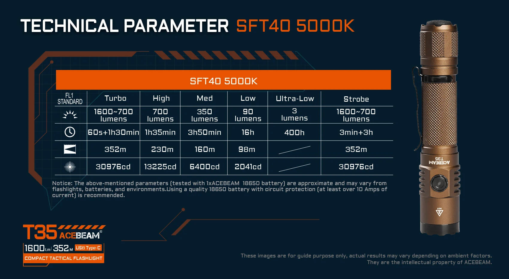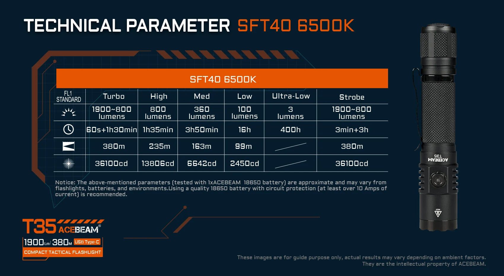 The Acebeam T35 is a Compact Tactical Flashlight allows tasks to be done easily. Equipped with an SFT40 LED emitter, it uses an 18650 battery to have a max output of 1900 lumens. Accompanied by this great companion of a flashlight, you feel safer in darkness and can walk in most dark places with peace of mind, since this lighting tool is also designed for self-defense with a toothed attack bezel. It features a battery indicator, five output levels, and a strobe mode, that can meet diverse requirements in different settings.