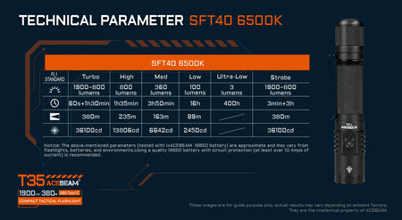 - Black 6500K SFT40: Max output: 1900 lumens, Max throw: 380m