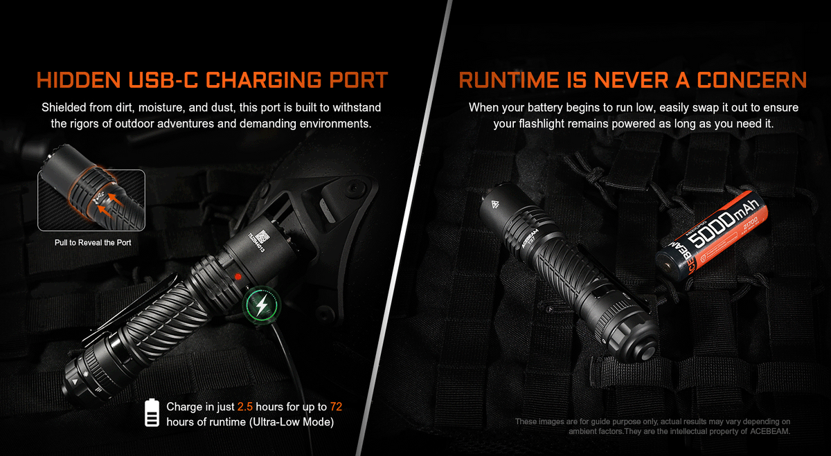 - Hidden USB-C charging port, allowing you to recharge the 21700 battery to full power in 2.5 hours, with a runtime of up to 72 hours in Ultra Low mode.