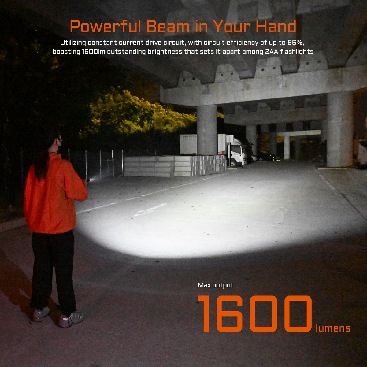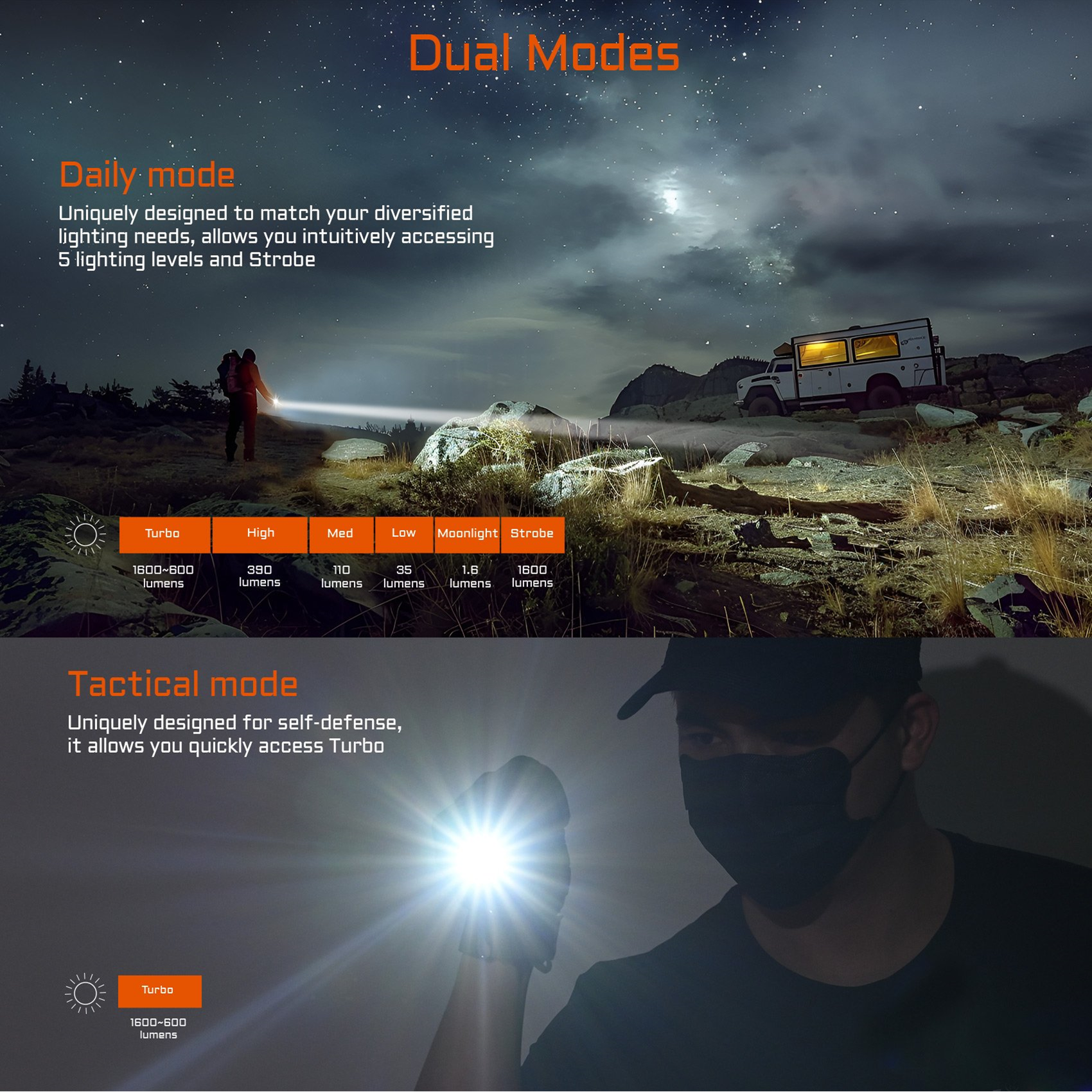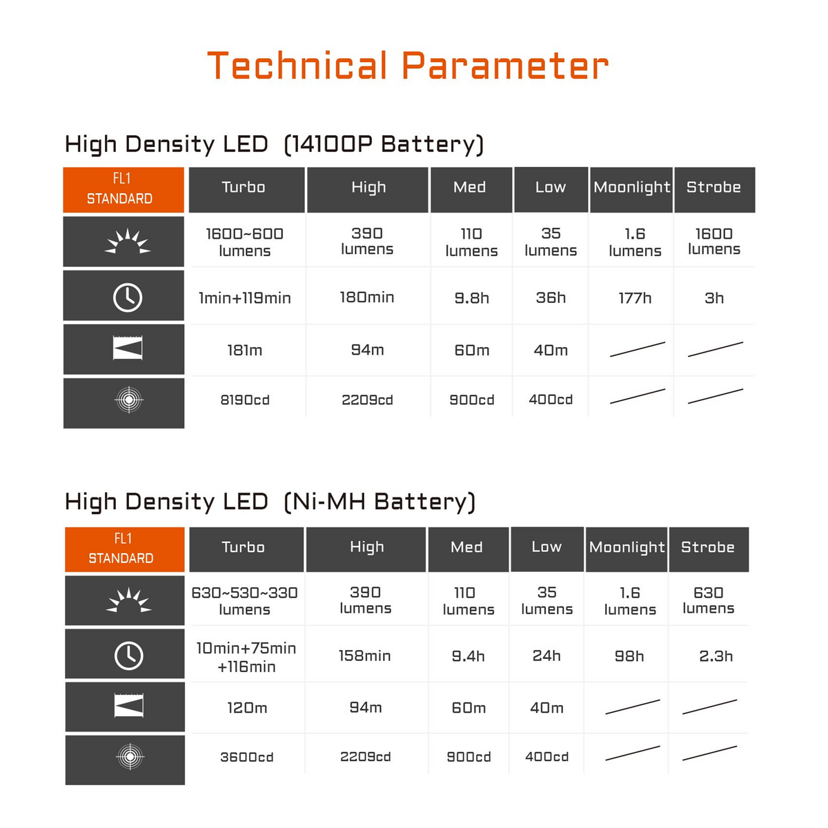 Turbo: 1600 ~ 600 lumens; 8190cd; 181 meters; 1 minutes + 119 minutes