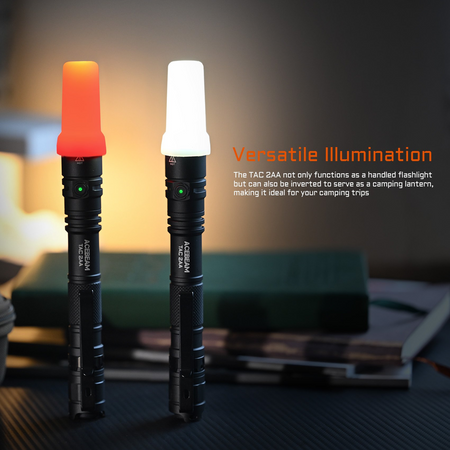 The Acebeam TAC 2AA is the brightest 2AA LED flashlight, featuring 1600 lumens of output and a beam distance of 181 meters. It uses a USB-C rechargeable battery and is compatible with 2 AA batteries, allowing for quick and easy power replacement. With tactical and everyday modes, it is lightweight, portable, and perfect for EDC carry, meeting various daily needs such as dog walking, home security, emergencies, camping, and hiking.