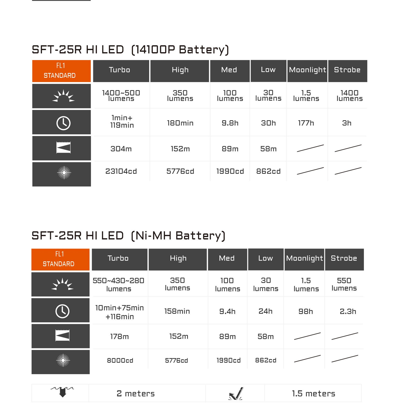 - Max 1400 lumens (SFT-25R HI 6500K)