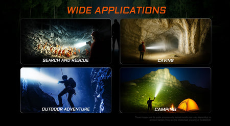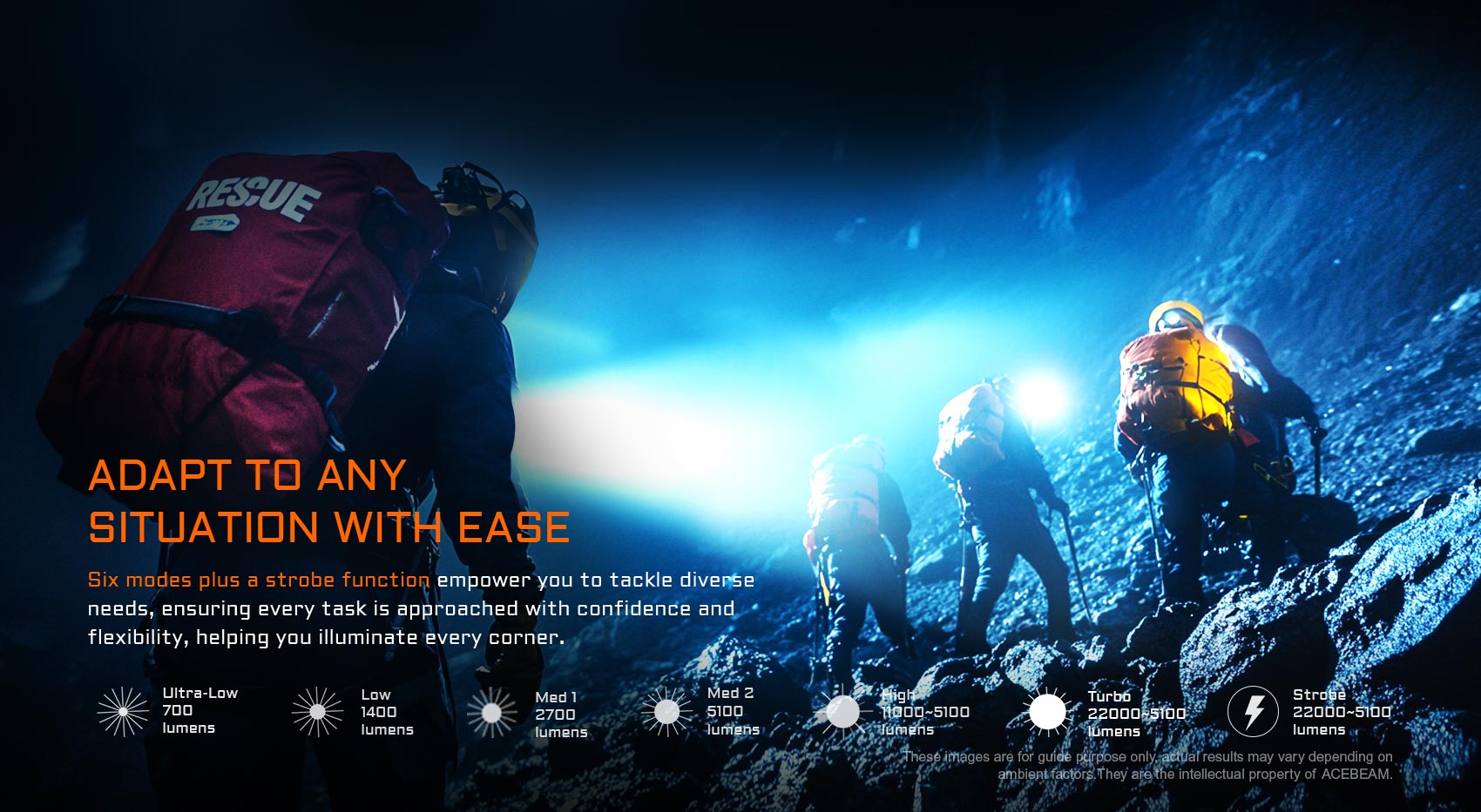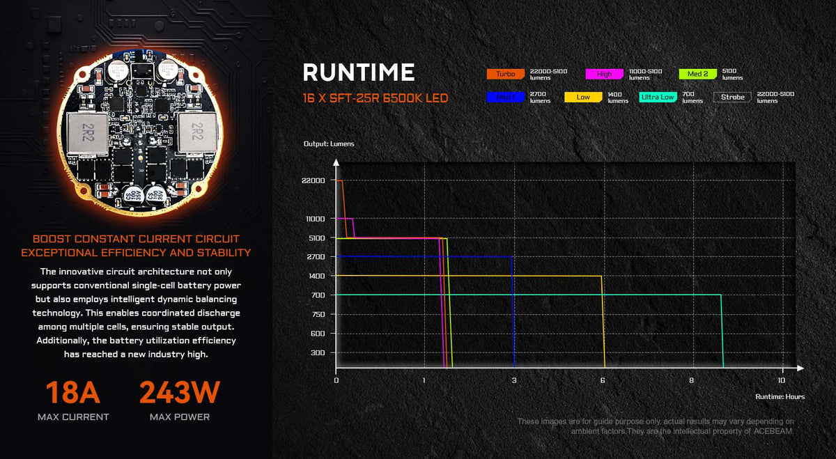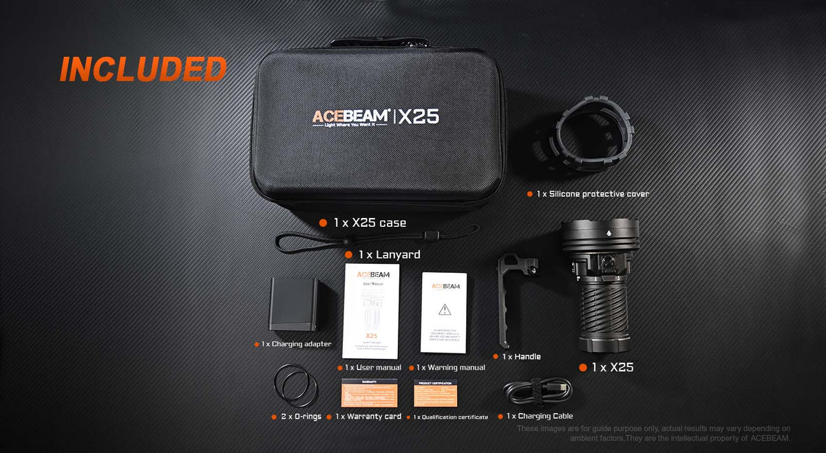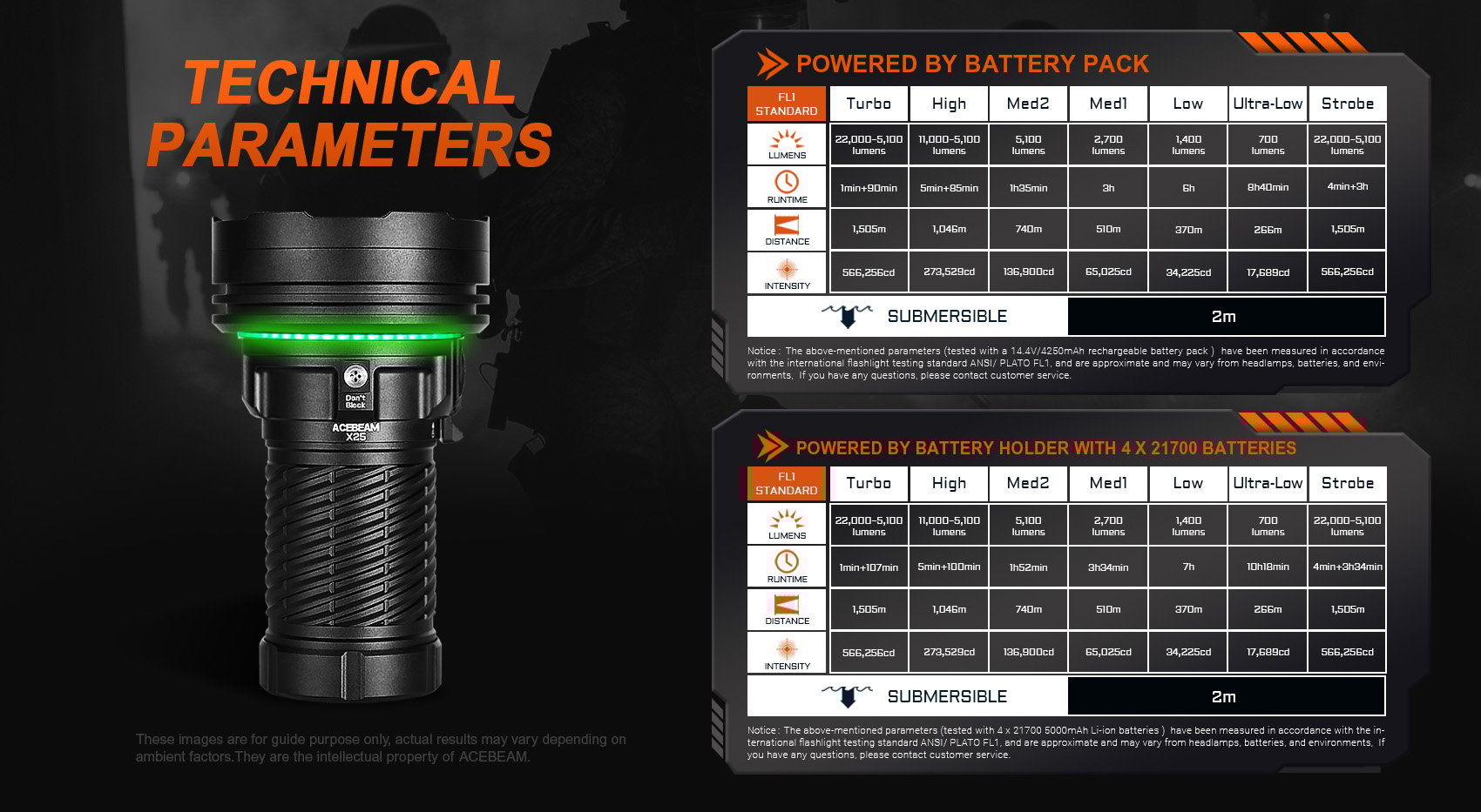 •Powered by 16 x SFT-25R LEDs, the ACEBEAM X25 unleashes a dazzling maximum output of 22,000 lumens, illuminating your path with an astonishing beam distance of up to 1,505 meters.