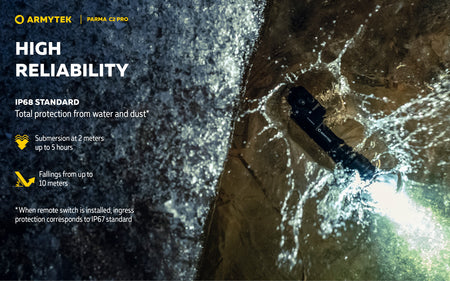 Total protection from water, dirt and dust in accordance with IP68 standard. When remote switch is attached, ingress protection corresponds to IP67 standard. Withstands fallings from 10 meters.