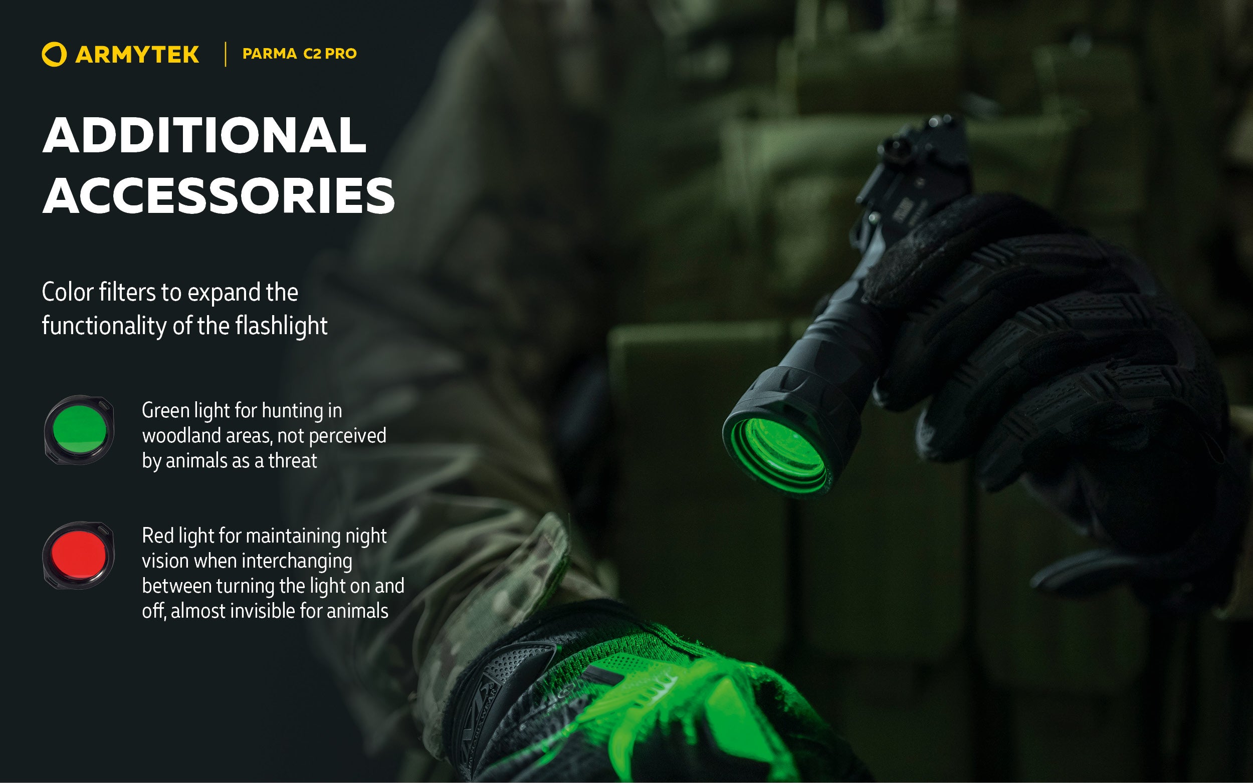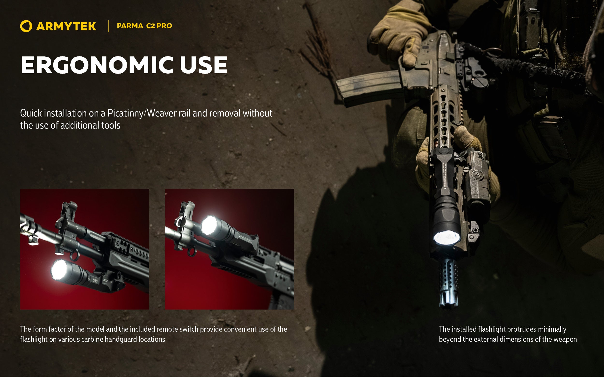 The Parma C2 Pro is a tactical flashlight with integrated mount for installation on a rifle or a carbine. The model is suitable both for use by special forces and for hunting.