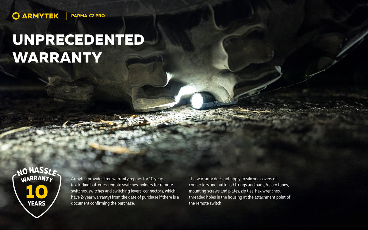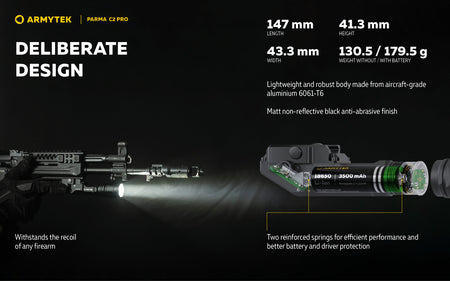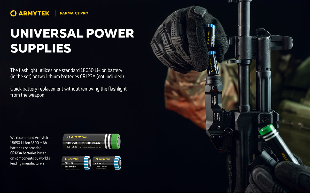 Parma C2 Pro works not only on the included battery, but also on any standard 18650 Li-Ion battery or two CR123A lithium batteries. Compatibility with batteries of various types allows to significantly increase the operating time of the flashlight in conditions of prolonged stay away from the permanent location: all one needs is to take a few spare power sources. The model is also characterized by ergonomics and ease of use. Thanks to the integrated mounting, the installation on a Picatinny/Weaver rail is performed without additional tools. Due to the small size and low profile, the installed flashlight protrudes minimally beyond the external dimensions of the weapon.