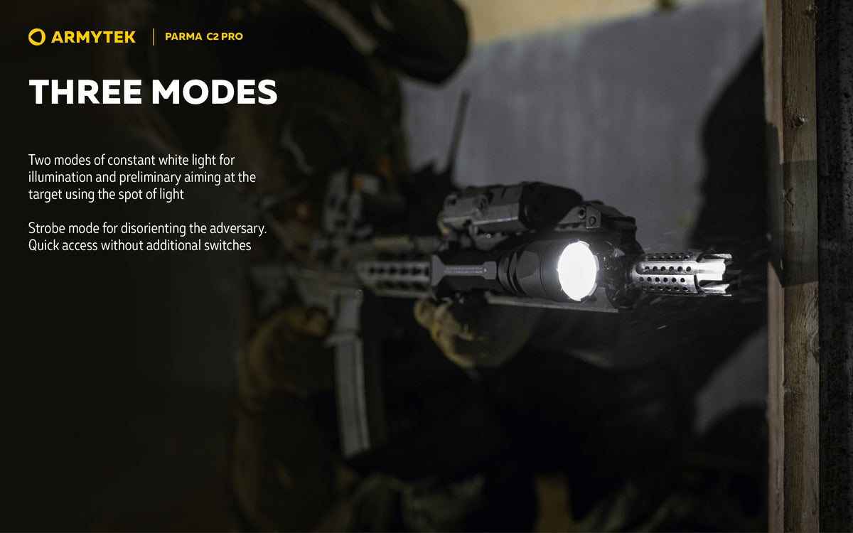 Two brightness modes of constant white light for illumination and preliminary aiming using the spot of light, Strobe mode for disorienting the adversary. Quick access to Strobe mode without additional switches.