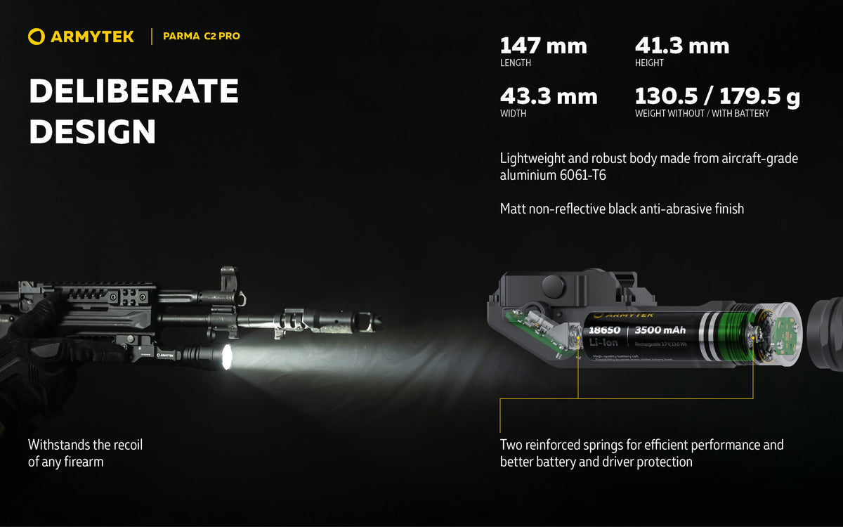 The use of two reinforced springs in the design of the flashlight for better protection of the battery and the driver. The flashlight withstands the recoil of any firearm.