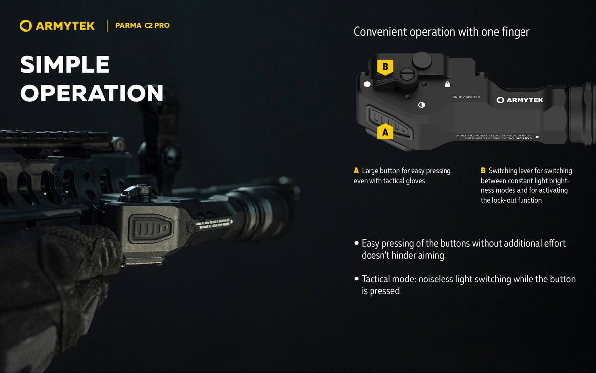 Convenient operation with one finger: large button for easy pressing even with tactical gloves. Switching lever for switching between constant light brightness modes and for activating the lock-out function.
