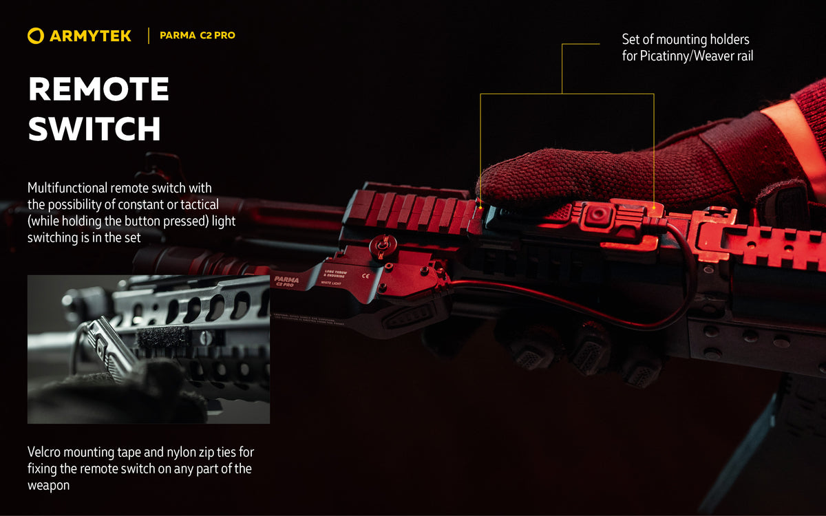 Multifunctional remote switch with the possibility of constant or tactical (while holding the button pressed) light switching is in the set.