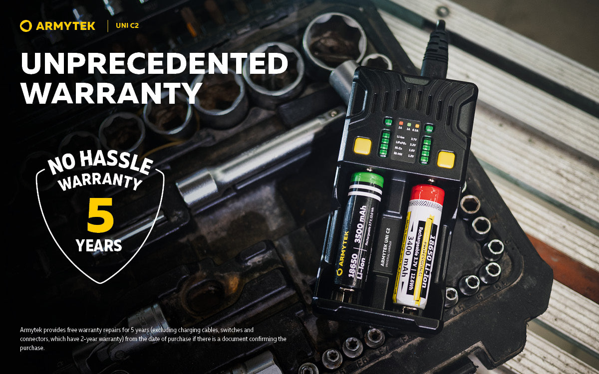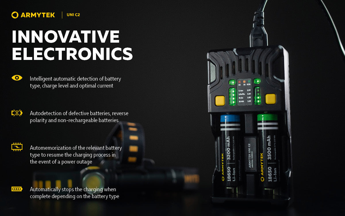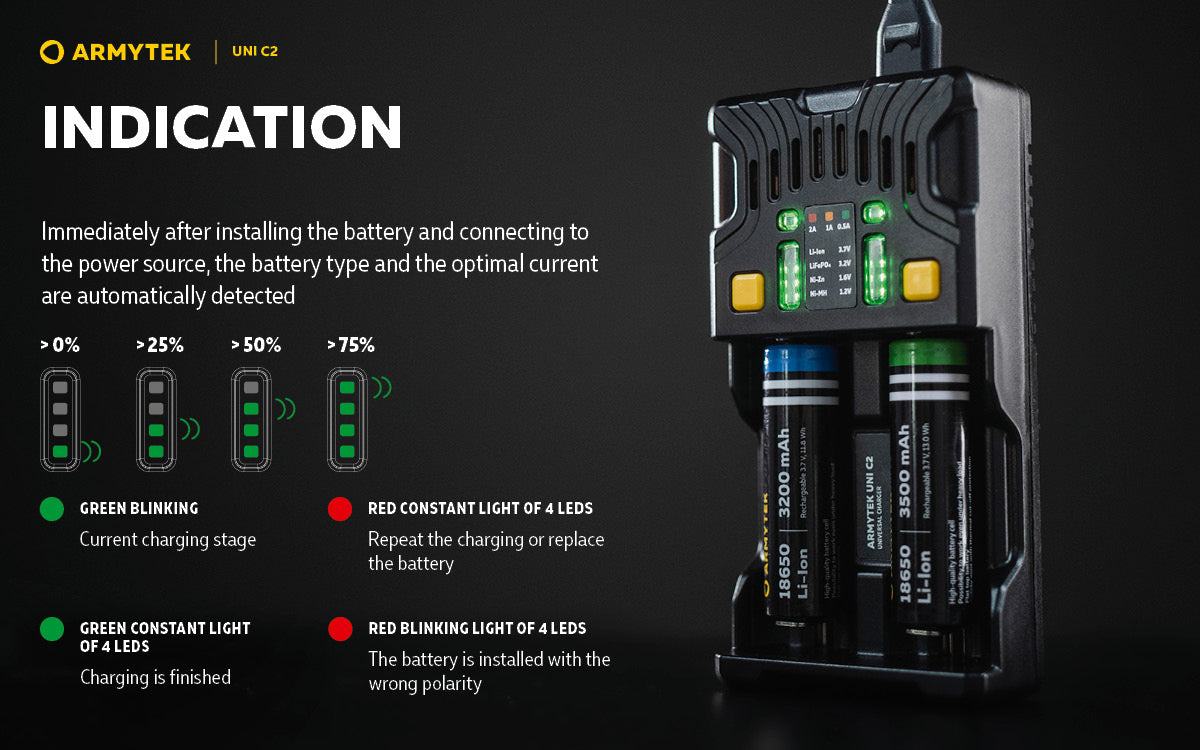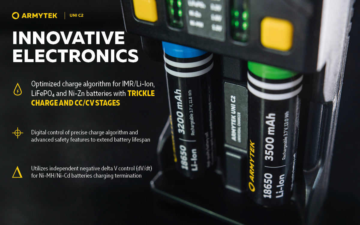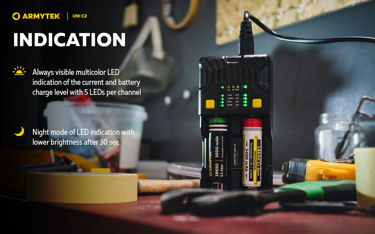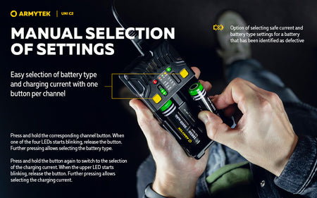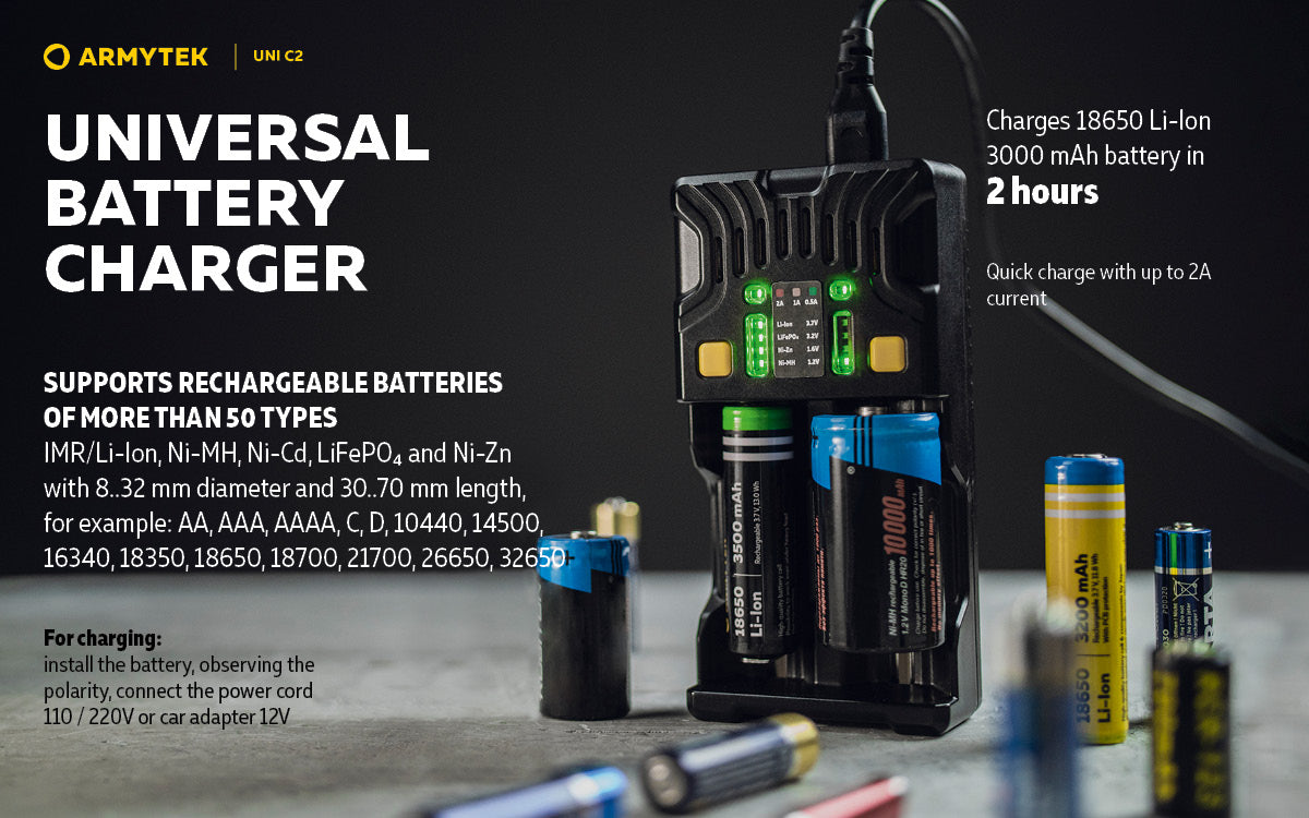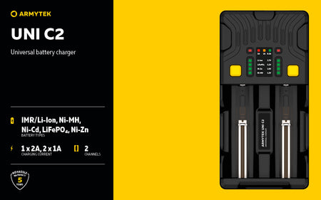 The Universal charger Armytek Uni C2 supports IMR, Li-Ion 4.2V, Li-Ion 4.35V, Ni-MH, Ni-Cd and Li-FePO4 batteries.