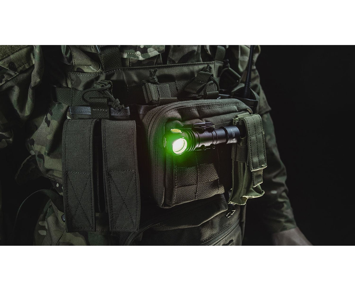 Thanks to the additional green output, the model is optimal for maintaining night vision when interchanging between turning the light on and off: in a camping tent, for reading maps when navigating the terrain, during the preparation of fishing gear or when organizing an ambush on a hunt, as well as in professional use.
