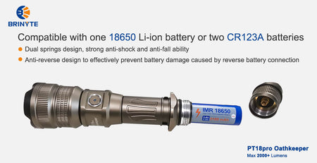 - Compatible with one 18650 battery or two CR123A batteries (18650 Battery Included)