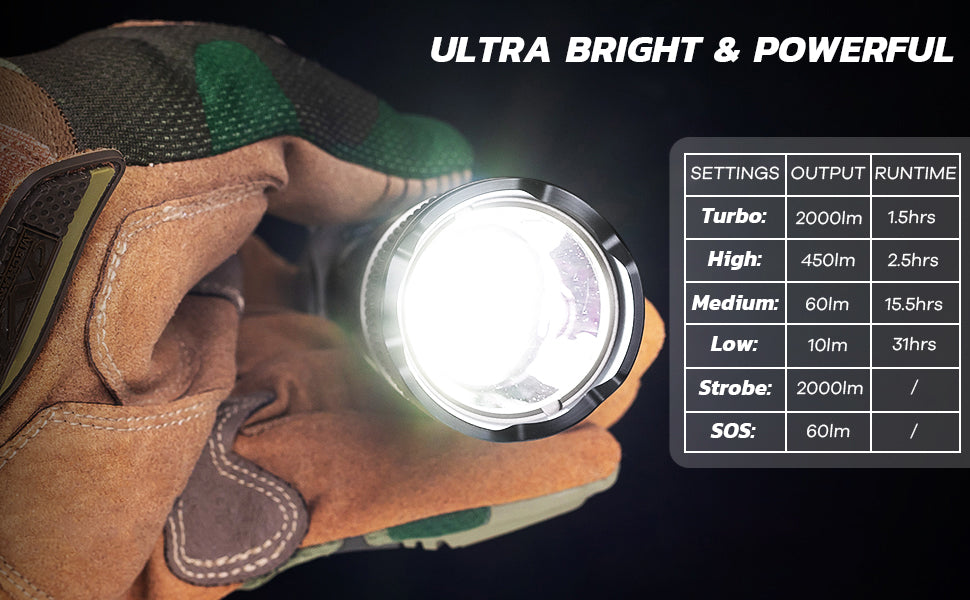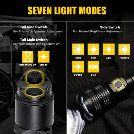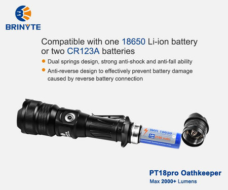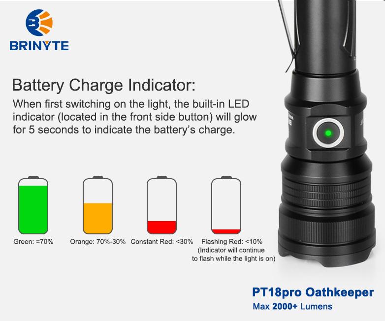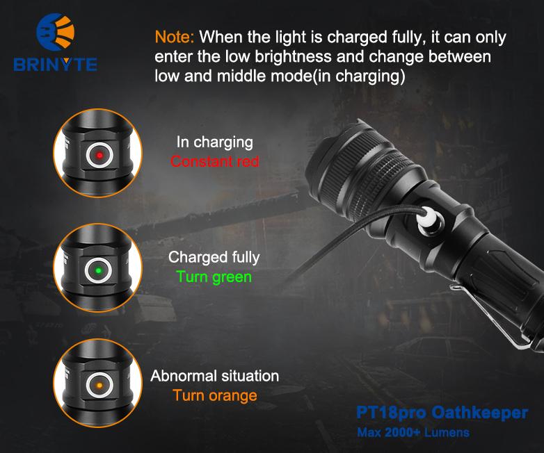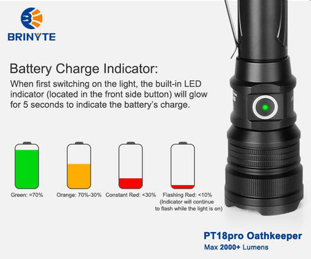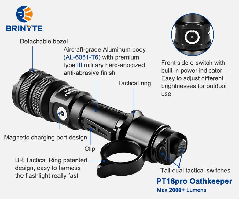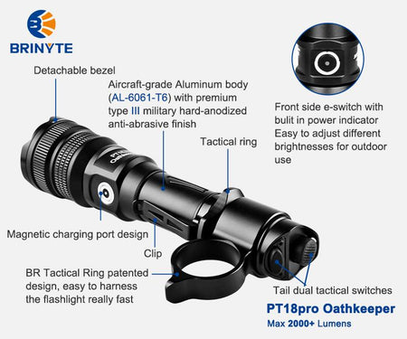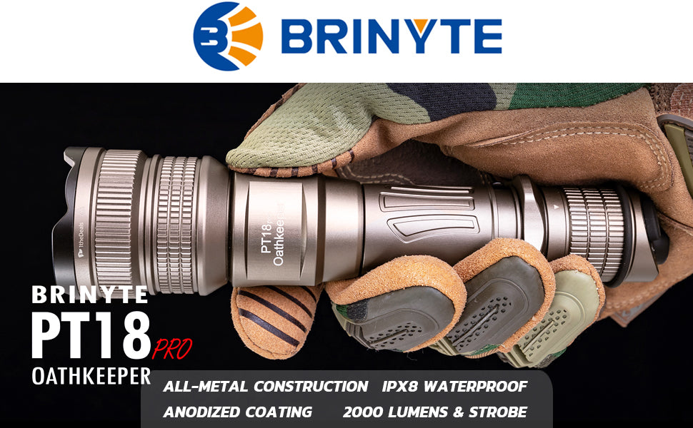 The Brinyte PT18Pro Oathkeeper is a tactical light for military, law enforcement officers and outdoor sportsmen. Its maximum output can reach 2000+ lumens with its cutting-edge CREE XHP35 LED. The light includes tail dual switches and supports touch-to-turbo and touch-to-strobe functions. Thanks to the magnetic charging port, the light's charging time is greatly reduced. Featuring a patented tactical ring design, intelligent power indicator and anti-false trigger, The Brinyte PT18 Pro is the lighting device of choice for outdoor sports such as hiking, camping, fishing, and other extreme adventures. Brinyte flashlights are specifically tested for outdoor use and harsh environments.