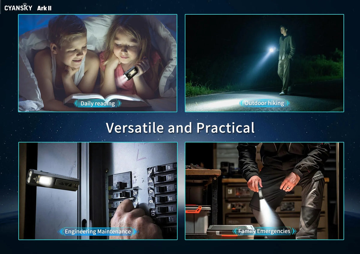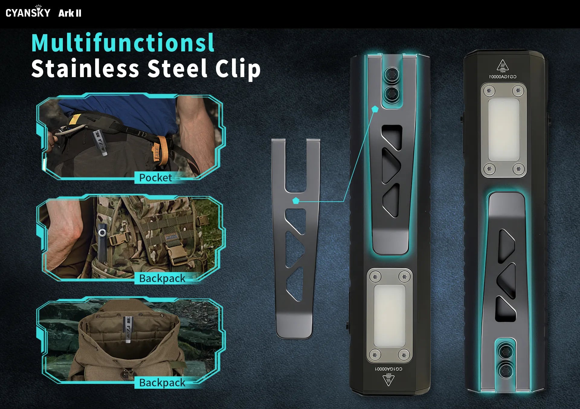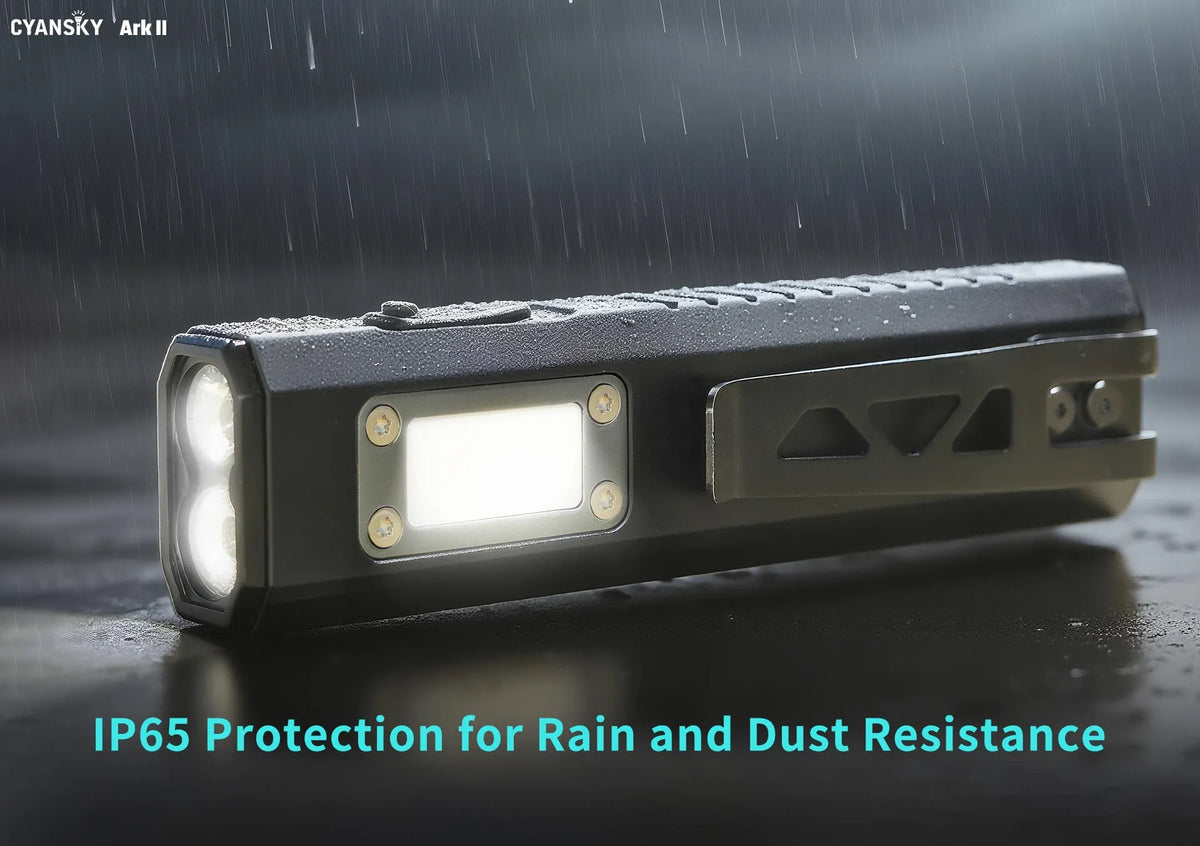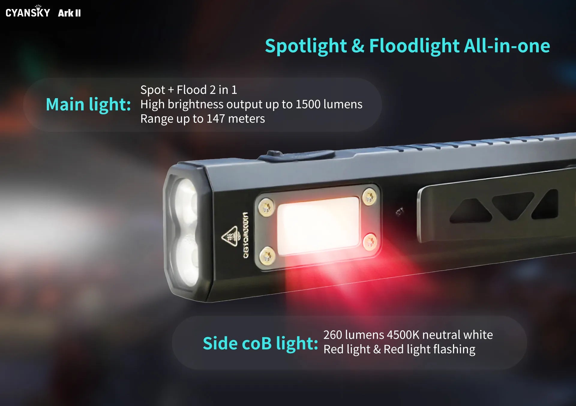 The Cyansky Ark II is a slim, portable edc flashlight. It features a three-light system: the front light combines floodlight and spotlight functions, with an output of up to 1500 lumens; the side lights provide 4500K comfortable neutral white light and practical red light. It features a built-in high-capacity battery and supports Type-C fast charging. The metal clip and powerful magnetic tail design allow for hands-free use, enabling it to be securely attached to any surface. It is your reliable portable lighting companion.
