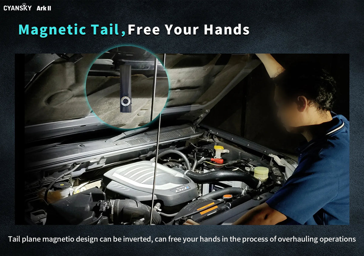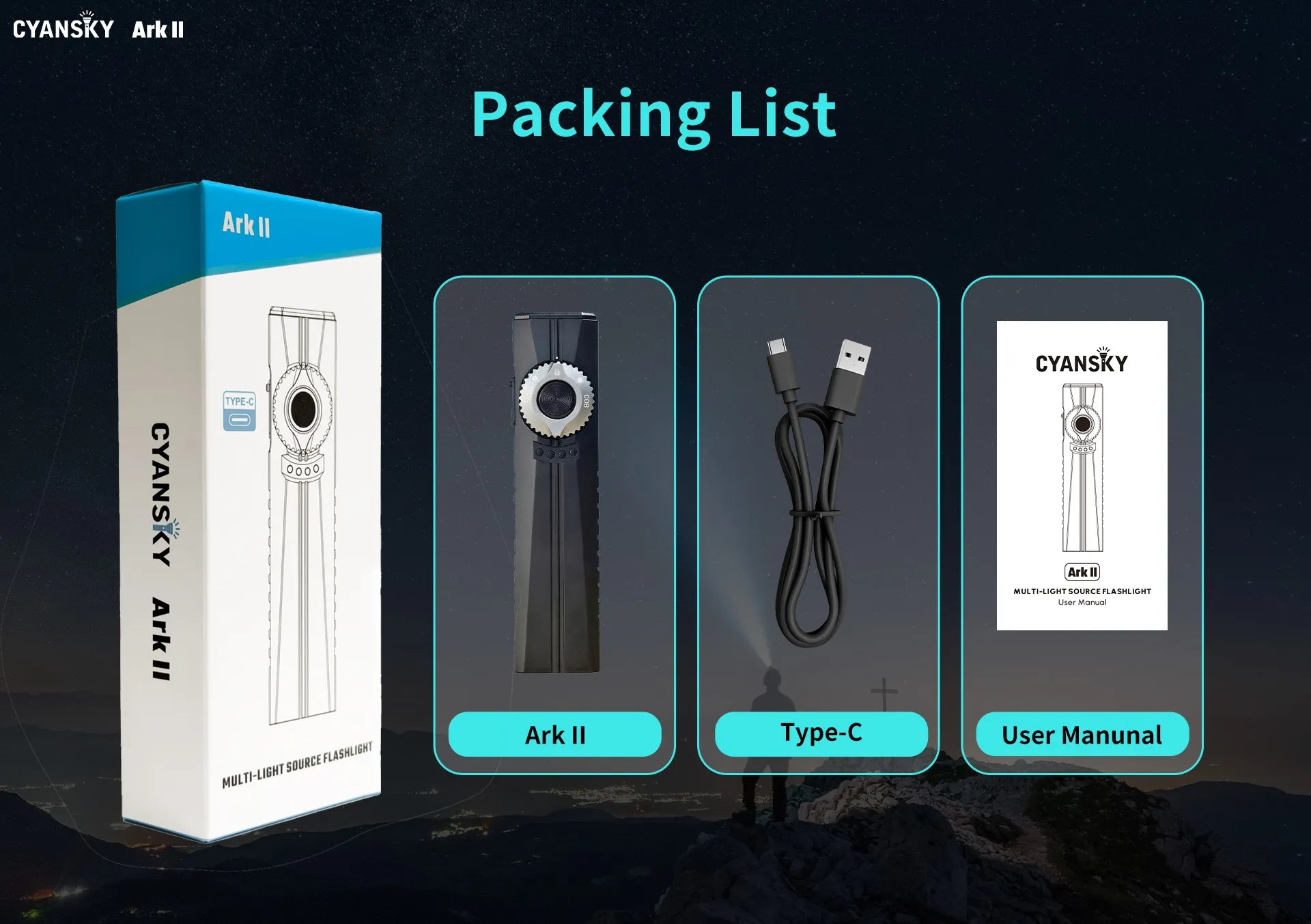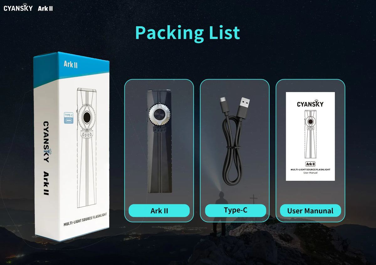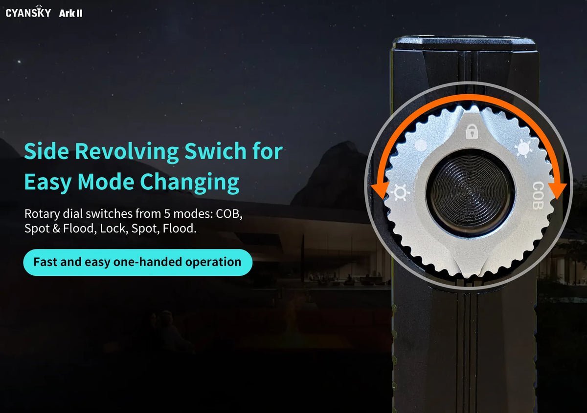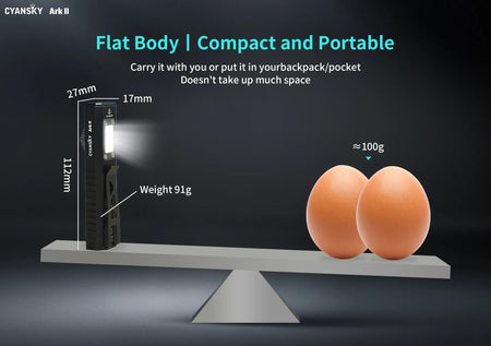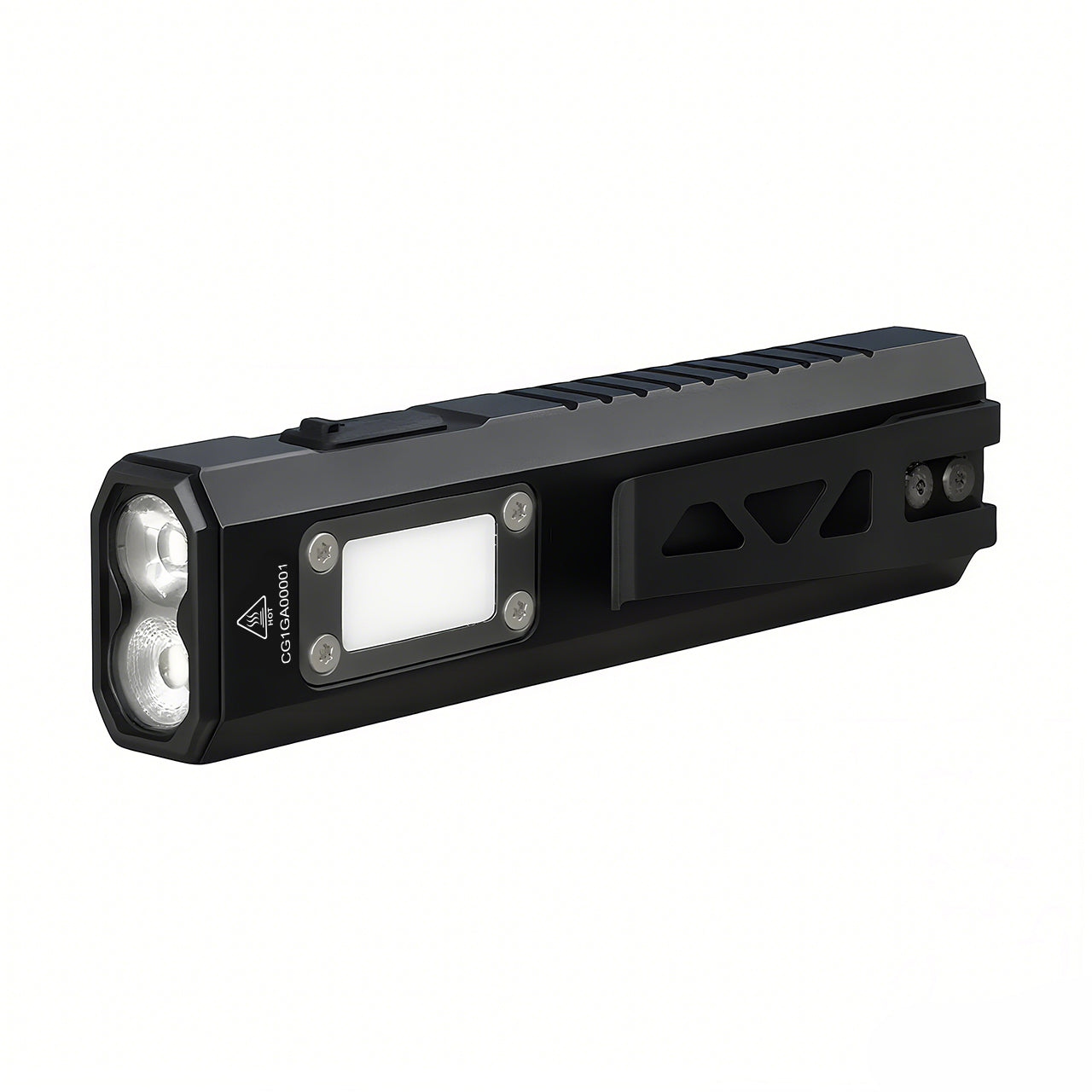 The Cyansky Ark II is a slim, portable edc flashlight. It features a three-light system: the front light combines floodlight and spotlight functions, with an output of up to 1500 lumens; the side lights provide 4500K comfortable neutral white light and practical red light. It features a built-in high-capacity battery and supports Type-C fast charging. The metal clip and powerful magnetic tail design allow for hands-free use, enabling it to be securely attached to any surface. It is your reliable portable lighting companion.